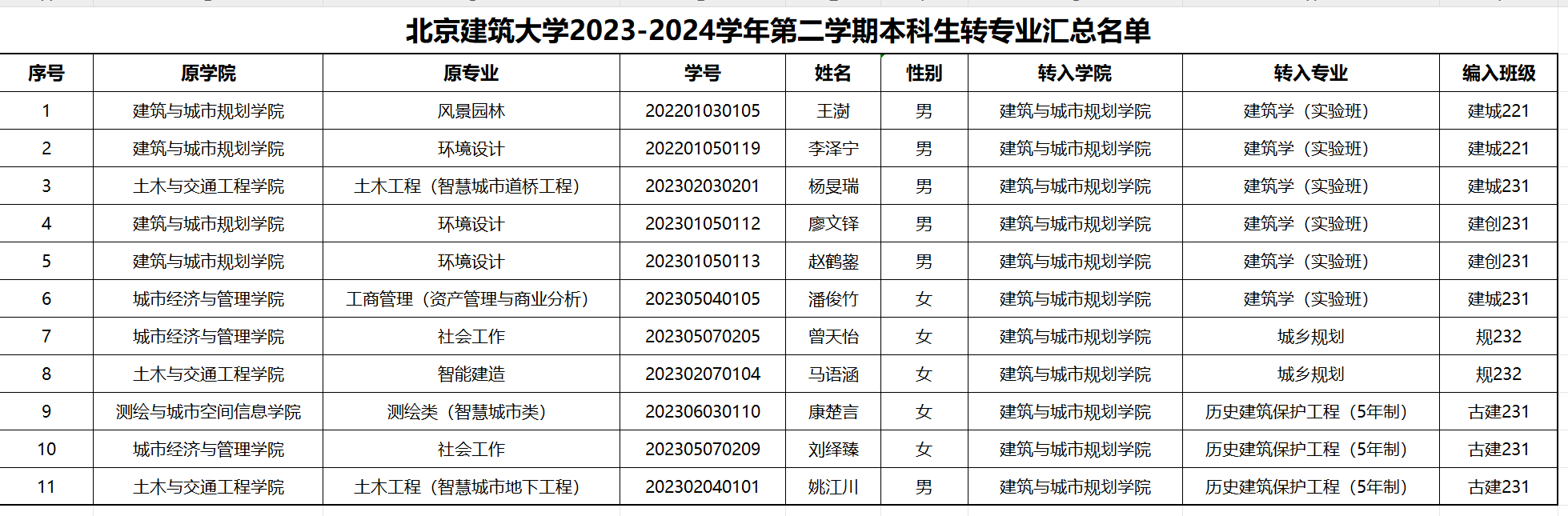 根据北京建筑大学《关于印发北京建筑大学本科学生转专业管理规定的通知》(教字〔2024〕88号)的要求,依据公平公正公开的原则,建筑学院于2024年7月8日组织了美术、制图考试与面试。经过建筑学院综合评议,现将拟录取名单公示如下: