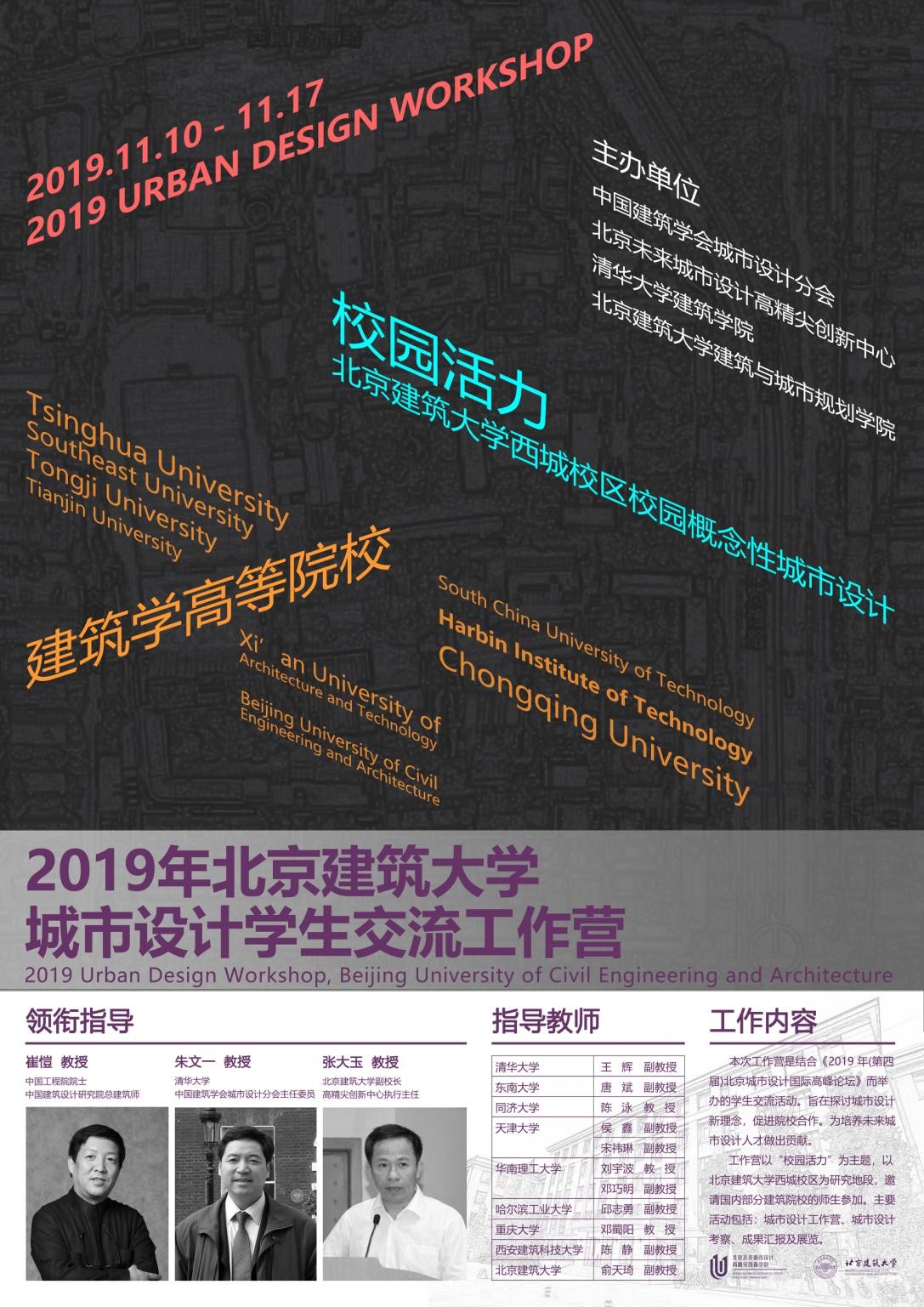 本次工作营将持续一周,9所院校各派出指导教师1名、高年级本科生4名,通过混合编组的形式开展。工作营主题是“校园活力——北京建筑大学西城校区校园概念性城市设计”,设计成果将在“2019年(第四届)北京国际城市设计大会”中展出,并在大会开幕式上举行颁奖仪式。参加工作营的指导教师还将受邀参加大会的“城市设计教育与人才培养”分论坛,进行城市设计教育教学的深入探讨与交流。