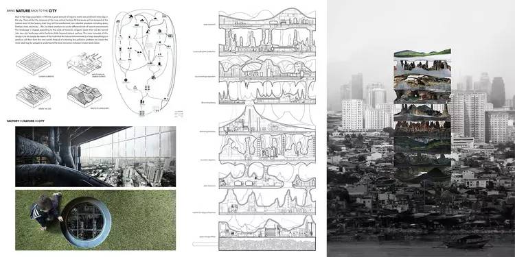 马尼拉(菲律宾首都)由于巨大的人口,每天都会产生大量的有机垃圾。这些垃圾将成为新的垂直工厂的资源。所有的废料都会倾倒在工厂的底层,然后被提取出有价值的产品——水、肥料、热能和电力。我们再用这些产品去打造不同的自然环境。景观是根据工厂的规模和形态进行塑造。有机垃圾之后就会被转变成新的城市景观,从而让工厂藏于自然的景观层次之下。本设计的主要概念是让人们意识到自然环境是一种循环,人们生产出的任何产品都将塑造出一片新世界。与其诟病污染问题,不如让我们创造一种理想的方式,让人们能够理解什么才是人与自然的最好互动。