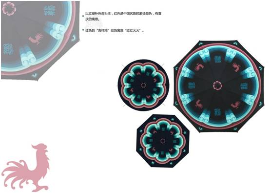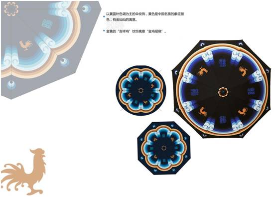他说着拿出两把造型精美的伞展示给我们看,这是团队成员李欣学姐所做的一套已经成型的文创产品。伞的纹饰运用古建彩画的“包袱”作为设计元素,包袱彩画的包袱心内容以“吉祥鸡”纹饰与篆体书写的“鸡”字交替共同组成8骨伞,纹饰指向和色彩等设计都带有独特的美好寓意,如“四季平安”、“金鸡报晓”。他们带着这套产品参加了一个关于鸡年生肖的文创竞赛。尽管只入围了初赛,通过这次经历,他们发现中国的文创产品拥有广阔的市场,关键在于如何把消费和创意合理结合。