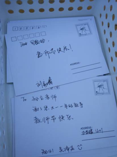 今年的教师节恰逢周日,为了能将心意送到,学生会的同学们在教师节的前一天亲手将贺卡送到老师的手上。老师们收到贺卡,纷纷表示收到了同学们的祝福很感动,同时也祝同学们学业顺利。