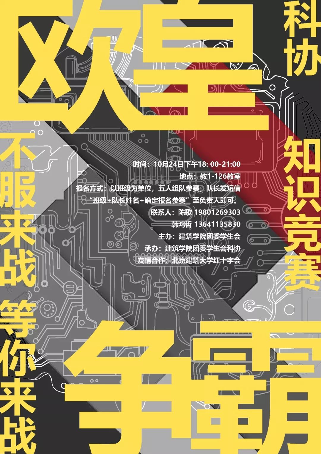为以趣味形式丰富建筑学院学生的文娱生活,激发学生对身边知识的探索,展现建筑学院学生的风采。10月24日晚上六点,第四届“欧皇争霸”不服来战百科知识竞赛在教一126准时开赛。本次竞赛由建筑学院团委学生会主办,建筑学院团委学生会科协承办,以班级为单位,五人组队参赛。2018级五个专业在内的9个班级积极参与。在科协部员的主持下,竞赛正式拉开帷幕。