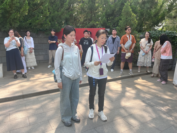 在高君宇与石评梅双人塑像旁,同学们深情地朗诵了石评梅所写的《墓畔哀歌》。杨老师详细讲解了诗歌中蕴含的极致哀婉和生死相隔的永恒之痛,让同学们深刻体会到了那段真挚而又令人惋惜的爱情。朗诵结束后,同学们纷纷展开讨论,分享自己对革命先辈理想信念和爱情观的看法,从他们的故事中汲取精神力量。