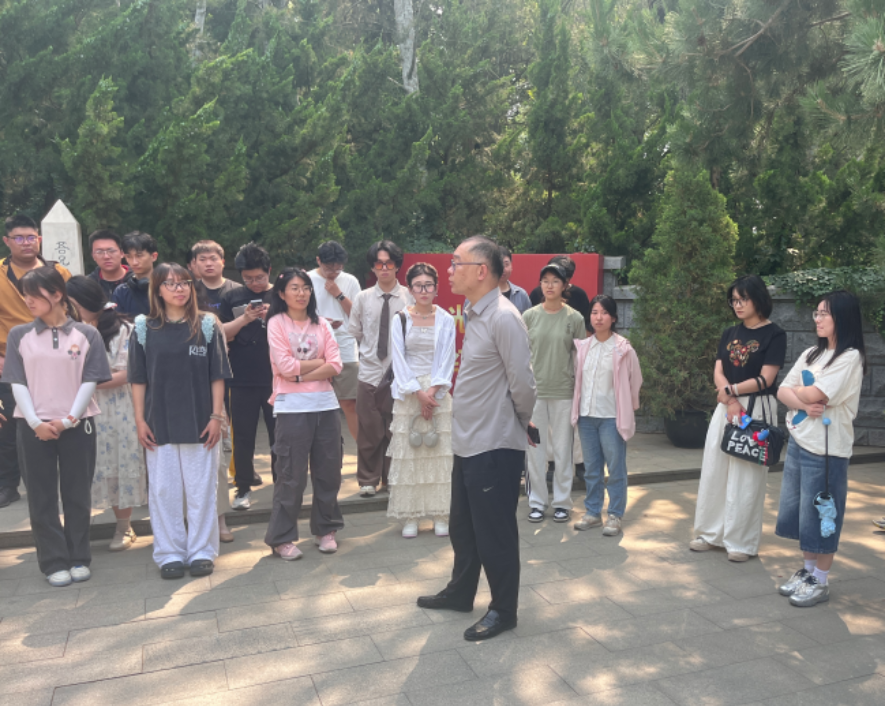活动伊始,同学们在杨举老师的带领下来到高君宇墓前。杨老师向同学们讲述了高君宇与石评梅的爱情故事,让大家了解到在那个动荡的年代,革命先辈们不仅有着坚定的理想信念,还有着忠贞不渝的爱情。高君宇作为中国共产党早期领导人之一,为革命事业做出了卓越贡献。高君宇因长期为革命奔波劳累,年仅29岁便英年早逝,石评梅悲痛万分,将他的骨灰安葬于陶然亭,并亲手题写墓碑,后来石评梅也病逝葬于高君宇墓旁,实现了“灵魂依傍孤坟”的誓言,这不仅是恋人的告白,更是革命者对理想的宣言。