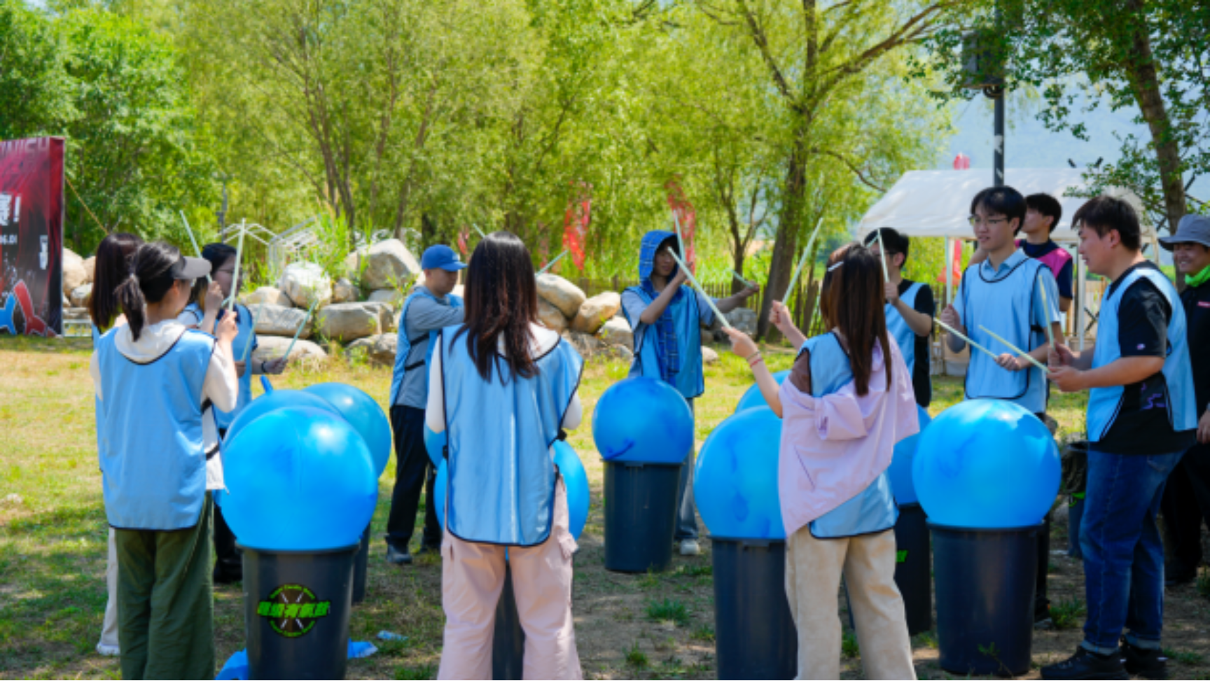 在素拓教练的组织和指导下,同学们迅速投入到紧张而有趣的拓展项目中。首先进行的是《超级有氧鼓》项目体验。在教练的引导下,同学们分组协作、共想队名,随着节奏的起伏,手持鼓棒敲打出激昂的鼓点。这不仅是一场音乐的盛宴,更是一次团队协作的考验。大家在鼓声中释放压力,亲近自然,愉悦身心,迅速拉近了彼此之间的距离。