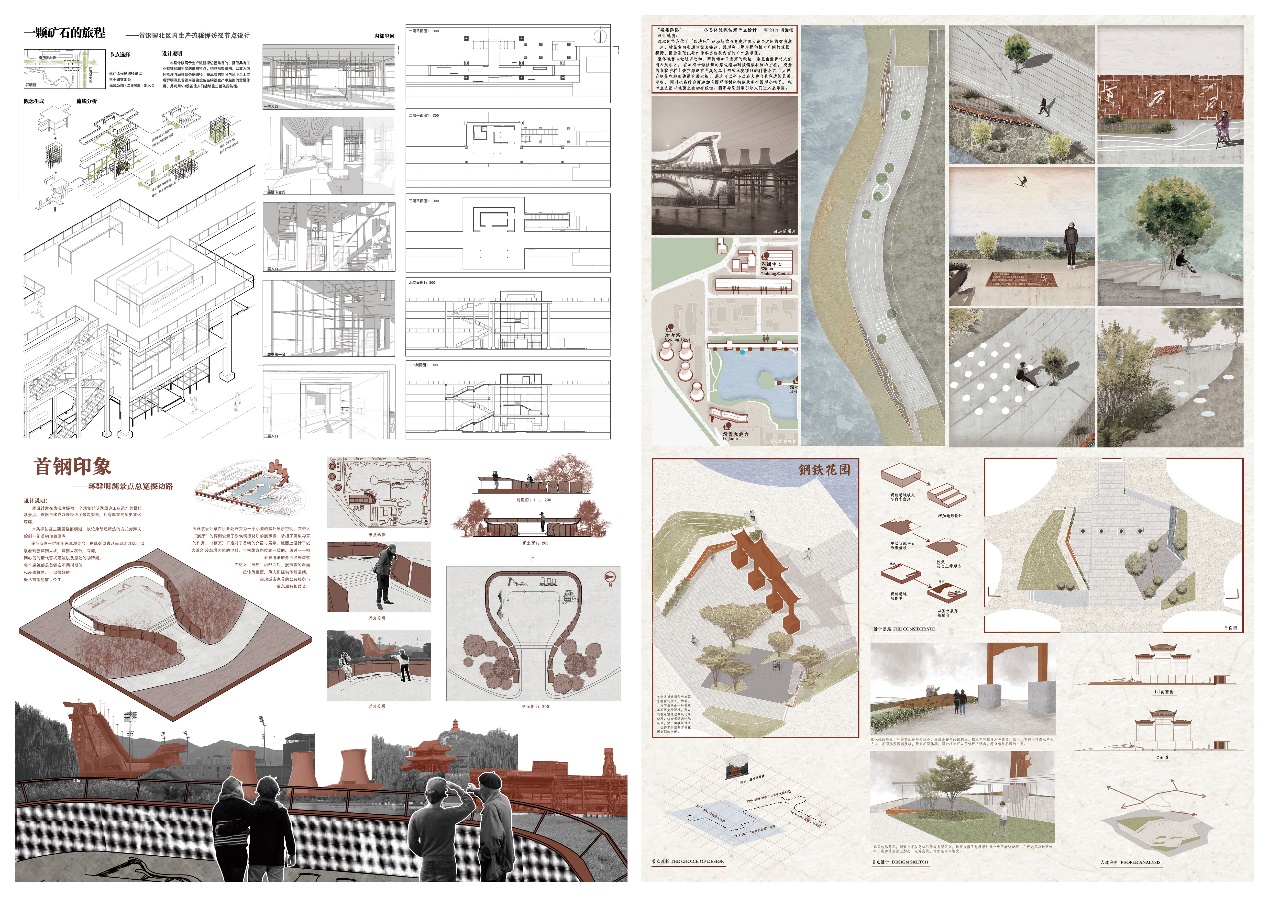 第二组《“清晰首钢”——首钢园北区工业遗产探访路及城市家具系统设计》图纸(部分)