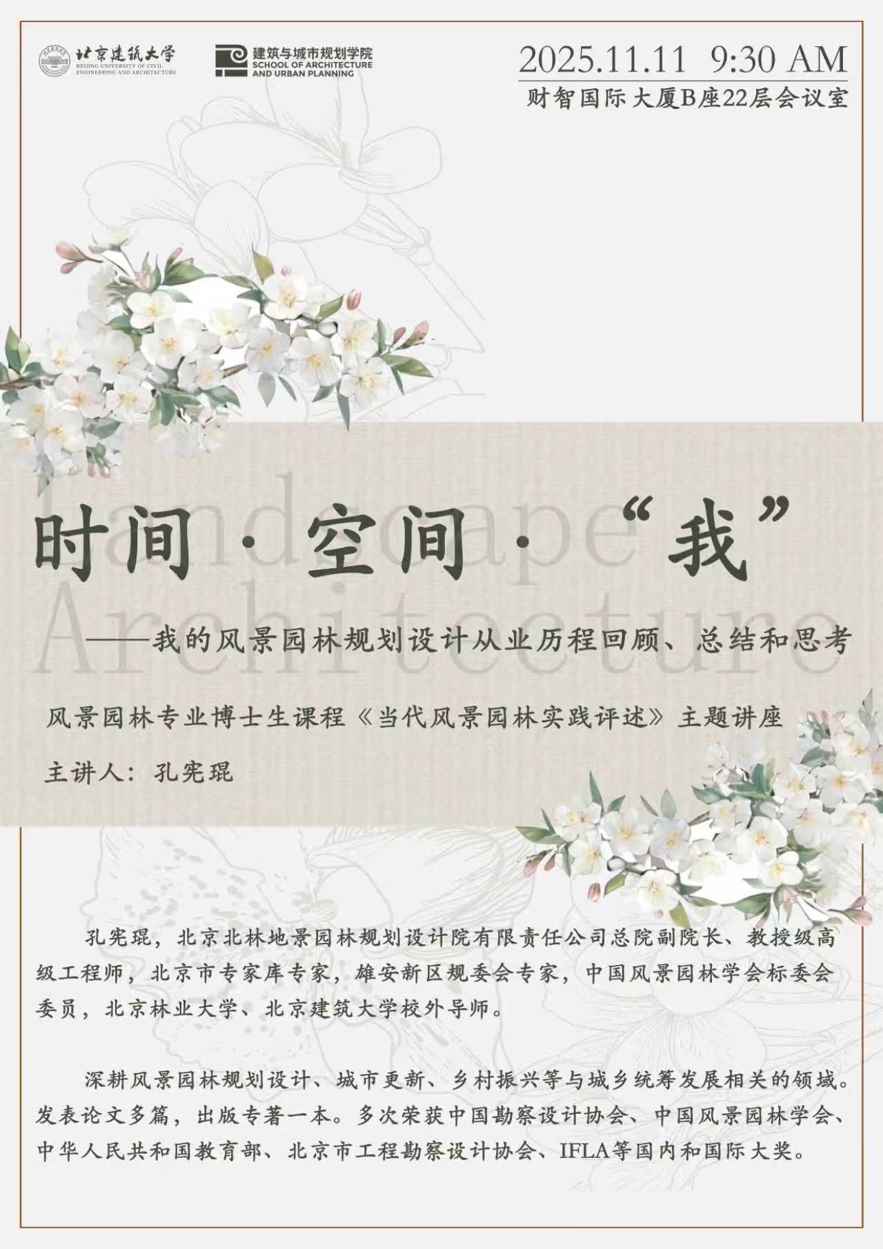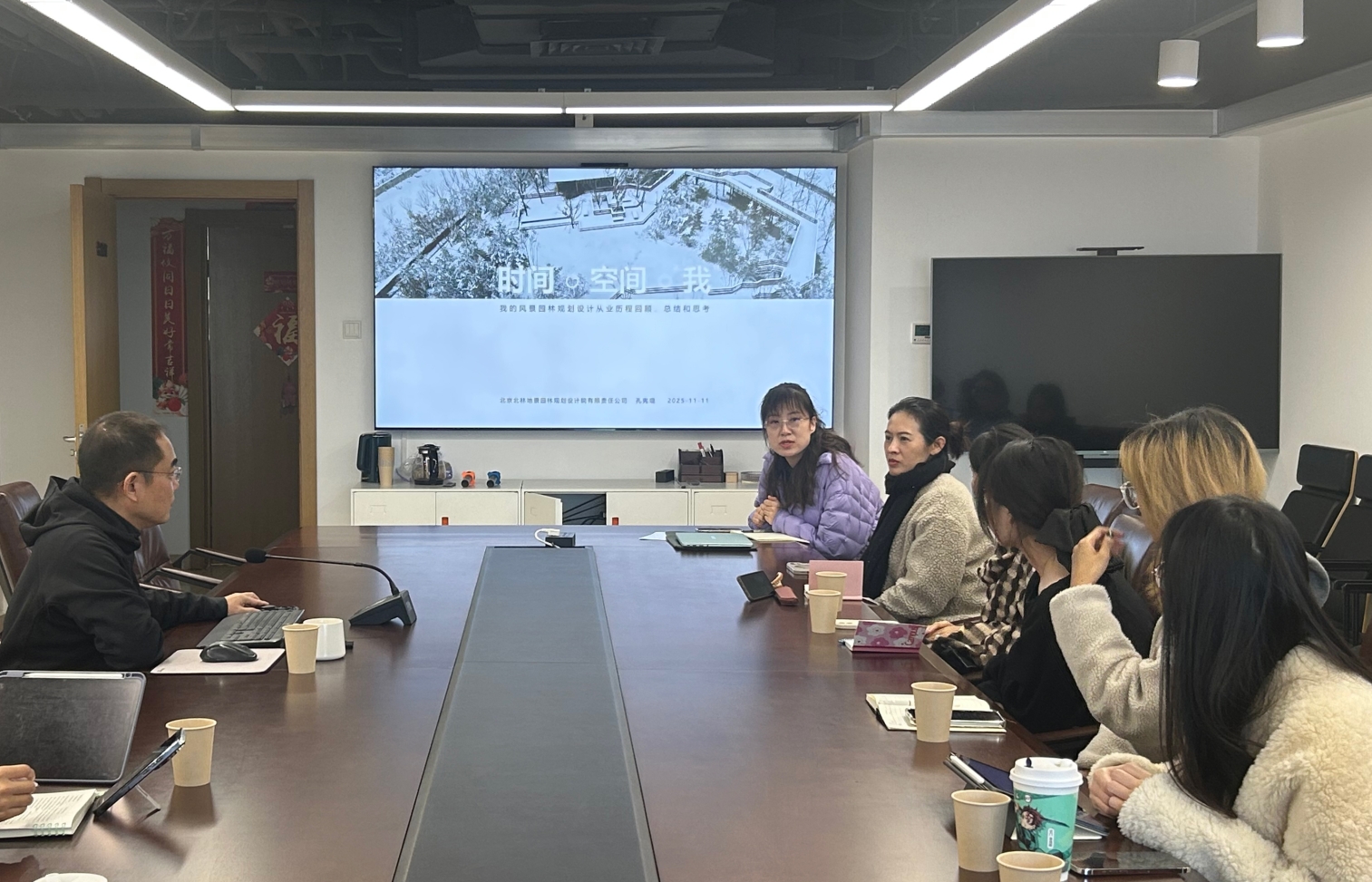 11月11日上午,北京建筑大学风景园林博士生课程《当代风景园林实践评述》师生赴北林地景园林规划设计院,共同学习由总院副院长孔宪琨带来的题为《时间·空间·“我”》的主题讲座。讲座围绕其多年的风景园林规划设计实践,从案例作品的时间演进、空间变迁与设计师主体性三个维度,系统回顾并反思了风景园林的发展路径与精神内核。风景园林系傅凡、魏菲宇、李露三位老师及硕博士生共同参与了此次活动。