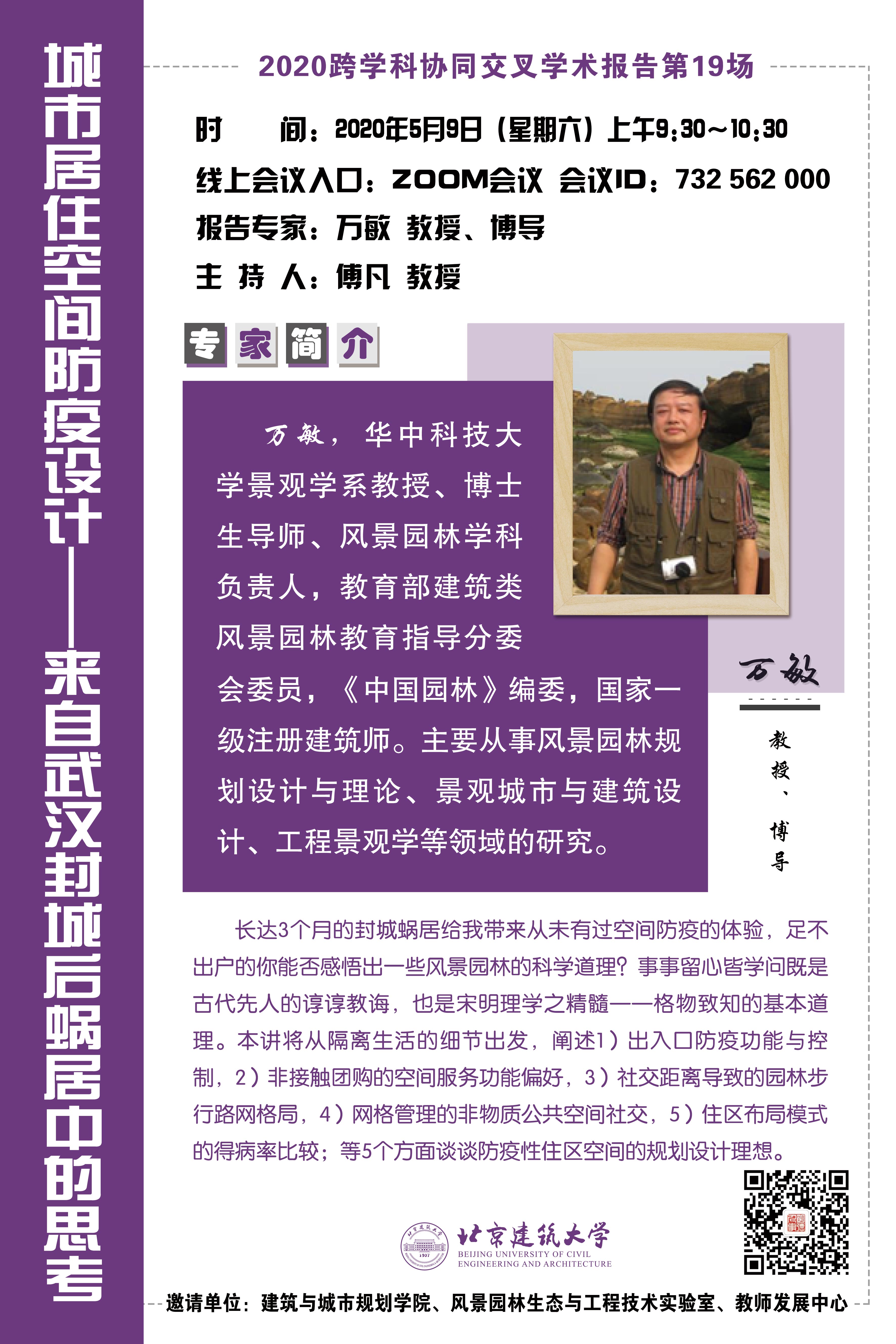 5月9日上午,华中科技大学景观系博士生导师、风景园林学科负责人、《中国园林》编委万敏教授应斗地主游戏 邀请,在ZOOM平台上以“城市居住空间防疫设计——来自武汉封城后蜗居中的思考”为主题展开分享,斗地主游戏 建筑学院傅凡教授主持本次讲座。来自斗地主游戏 师生和校外学者共100余人参与本次线上学术交流活动。