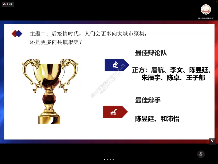 随后,另两支辩论队伍就辩题二“后疫情时代、人们会更多向大城市聚集,还是更多向县镇聚集?”,从以人为本的角度开展了讨论。在后疫情时代,人们的生活方式和需求也在疫情下不知不觉的悄然发生变化。正方从城市供给方面、人们的需求及经济产业三方面,提出疫情不会颠覆城市本身所具有的优势以及吸引力,人们还是会更容易向大城市聚集。反方认为县镇作为我国推进城镇化的重要空间、城镇体系的重要一环、城乡融合发展的重要纽带,有人们渴望的更和睦的人际交往,有更有特色的公共空间以及国家政策更多的倾斜和扶持。最终由“扈航、李文、陈昱廷、朱辰宇、王子郁、陈卓”组成的正方辩论队获胜,陈昱廷、和沛怡同学被选为“最佳辩手”。