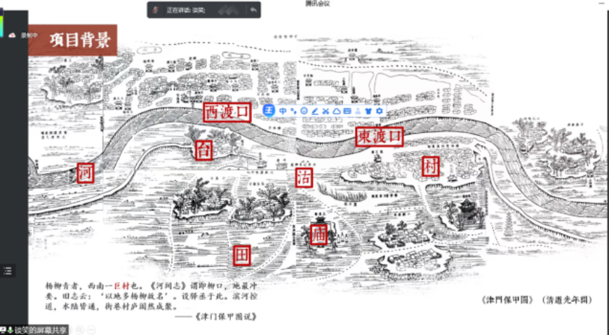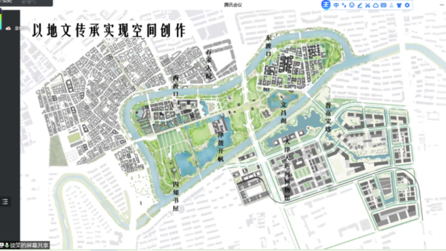 开题研讨会由开题介绍、开题交流、开题研讨三部分组成。首先,由出题方天津大学建筑设计规划研究总院谭啸所长对杨柳青大运河国家文化公园的项目背景进行了详尽介绍。2014年京杭大运河入选《世界遗产名录》,杨柳青作为沿运河两岸的“巨村“,承载了关于大运河南运河段的丰厚文化遗产与历史积淀。如今,大运河将作为国家文化公园重点建设项目之一,为运河文化的发展、运河两岸的活化利用提供了新的机遇。谭所长从杨柳青的历史脉络到民俗文化内涵,从非物质文化遗产、城乡建设、运河工程与自然环境等角度对运河进行多层次的文化解读,展现了运河文化“美的历程”。谭所长随后也对该地块已有的多轮设计进行简单介绍,如“以地文传承实现空间创作”、“文化学镇”等相关设计,为同学们对地块了解提供了更加开阔的视野。最后,谭院长结合已有工作提出了地块现状条件的详细信息与城市设计的刚性管控要求,如文物保护要求、核心保护区范围、建设地带的高度控制等等,并对本次联合毕设的成果表达期待与支持。