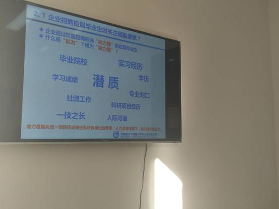 高部长首先详细阐述了职业生涯发展的五个阶段:探索期、形成期、突破期、稳定期、衰退期,指出了每个阶段的核心关键词;接着高部长解释了企业招聘应届毕业生时关注的因素:潜质、学习成绩、实习经历、人际沟通、一技之长等,重点解释了潜质的内涵即成长性是企业关注的核心,并使用冰山模型进一步解读了为什么潜质是企业最关注的核心因素;接着,针对大学生首次择业应该关注的因素,高部长指出人才成长平台、薪酬、区域、领导风格、人际关系等是应届毕业生应予以重点考虑的因素,并指出人才成长平台应是应届毕业生就业时首要考虑的因素,高部长还通过分享行业数据进行了论证,并亲自教授在场的同学如何辨别企业人才平台的成熟度;最后,高部长介绍了中航规划的人才成长指引路线、人才成长途径、人才培养体系。