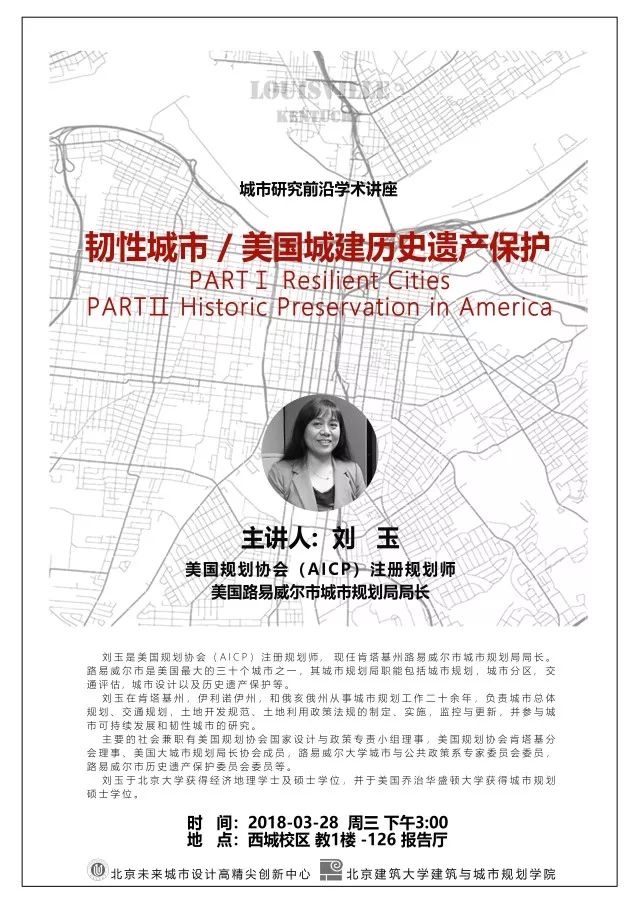 2018年3月28日星期三下午,美国路易威尔市城市规划局局长刘玉女士在北京建筑大学西城校区教1-126报告厅做了题为《韧性城市 / 美国城建历史遗产保护(Resilient Cities & Historic Preservation in America)》的学术讲座。建筑学院副院长胡雪松教授,北京未来城市高精尖创新中心主任李雪华教授和广大师生到场聆听,讲座由建筑系(含基础部)副主任李煜老师主持。
