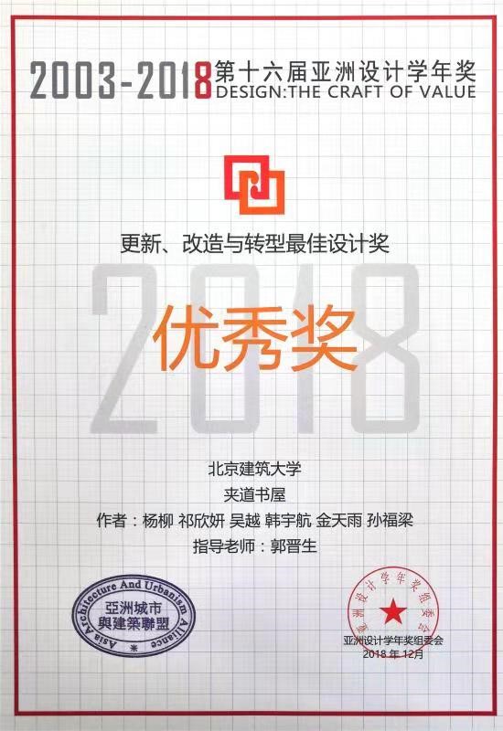 由斗地主游戏 建筑学院研究生杨柳、祁欣妍、韩宇航、吴越、建筑学本科生金天雨、孙福梁6名学生设计的“夹道书屋”建筑设计作品,荣获2018年第16届亚洲设计学年奖—更新、改造与转型最佳设计优秀奖,指导教师是郭晋生教授。