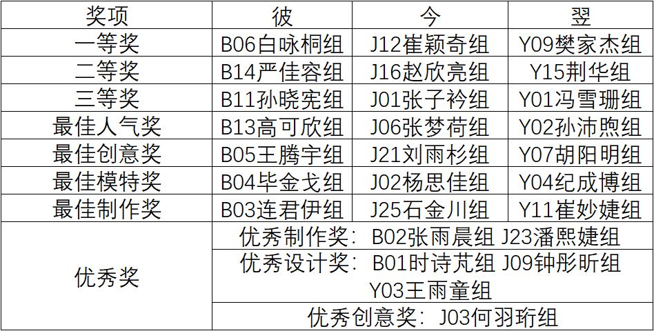 历时两个小时的服装盛宴,经过现场观众投票及专家评委打分,最终决出一等奖三名、二等奖三名、三等奖三名,以及最佳制作、最佳设计、最佳模特、最佳人气等奖项。由各组选手构筑起的时间长廊最终落下帷幕,绚丽的灯光下是学生们展示自己、放飞青春梦想的平台。在这里,青年学生们创新思维、丰富新时代大学生校园文化生活,展现建大学子朝气蓬勃、青春阳光的精神状态和时代风貌。