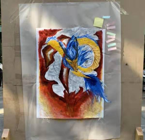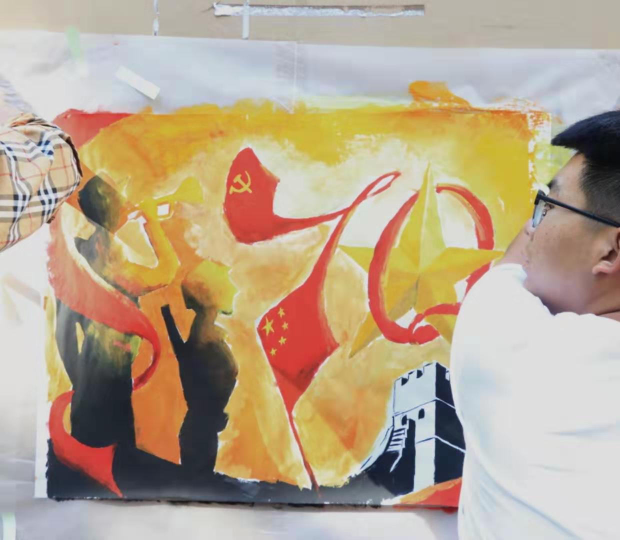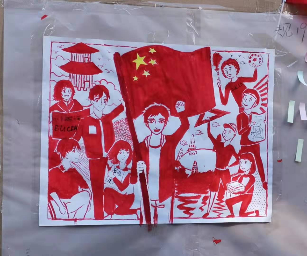 活动期间,同学们4-6人为一队,以“红色芳华”为主题绘制画作。在精心构思画面后,同学们齐心协力,运用了多种表现手法,创作出了属于自己的作品。在这一幅幅画作中,同学们不但描绘出了祖国70年来的日新月异,更重要的是表达了心中对祖国的憧憬和美好祝愿。