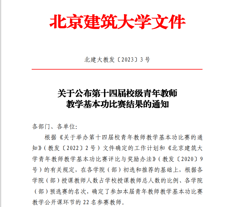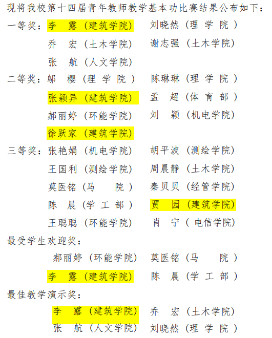 根据学校“关于公布第十四届校级青年教师教学基本功比赛结果的通知”(北建大教发〔2023〕3 号),建筑学院4名参赛教师分别获得比赛一、二、三等奖。其中,风景园林系李露老师获得一等奖、最受学生欢迎奖、最佳教学演示奖;城乡规划系张颖异老师、建筑技术部徐跃家老师获得二等奖、建筑系贾园老师获得三等奖。这次获奖再次展现了斗地主游戏 青年教师的教学风采和水平。