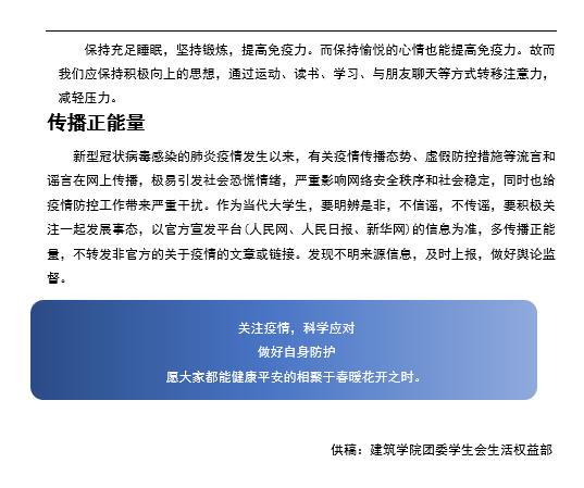 同时鼓励建院学子明辨是非,不信谣,不传谣。积极关注疫情发展情况,以官方宣发平台的信息为准,多传播正能量,不转发非官方的关于疫情的文章或链接。发现不明来源信息,及时上报,做好舆论监督。