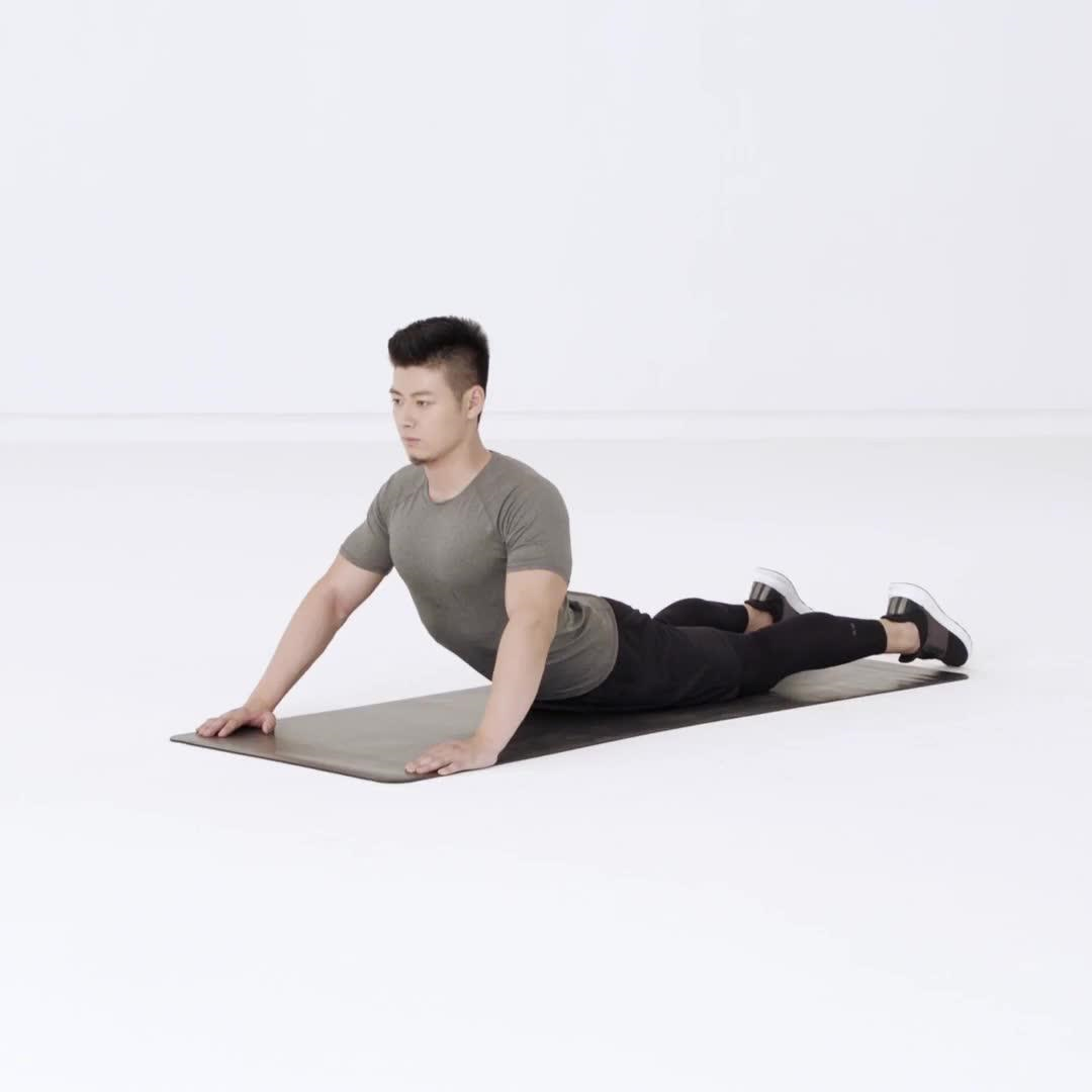 开始姿态:俯卧在瑜伽垫上,腿部完全贴紧地面