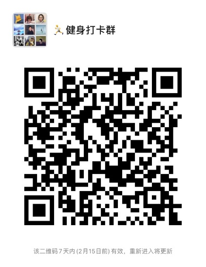 而且我们大家准备了“锻炼打卡计划”,大家可以扫下图二维码加入健身打卡群,每天参与打卡活动。微信群内将会有健身达人在线答疑,也会有健身经验干货分享,在这里你也能遇见志同道合的好伙伴….我们也会根据大家的打卡情况为积极的同学送出精美礼品,具体规则进群介绍,欢迎大家扫码进群!(若二维码失效可以添加体育部部长吴雨诺)