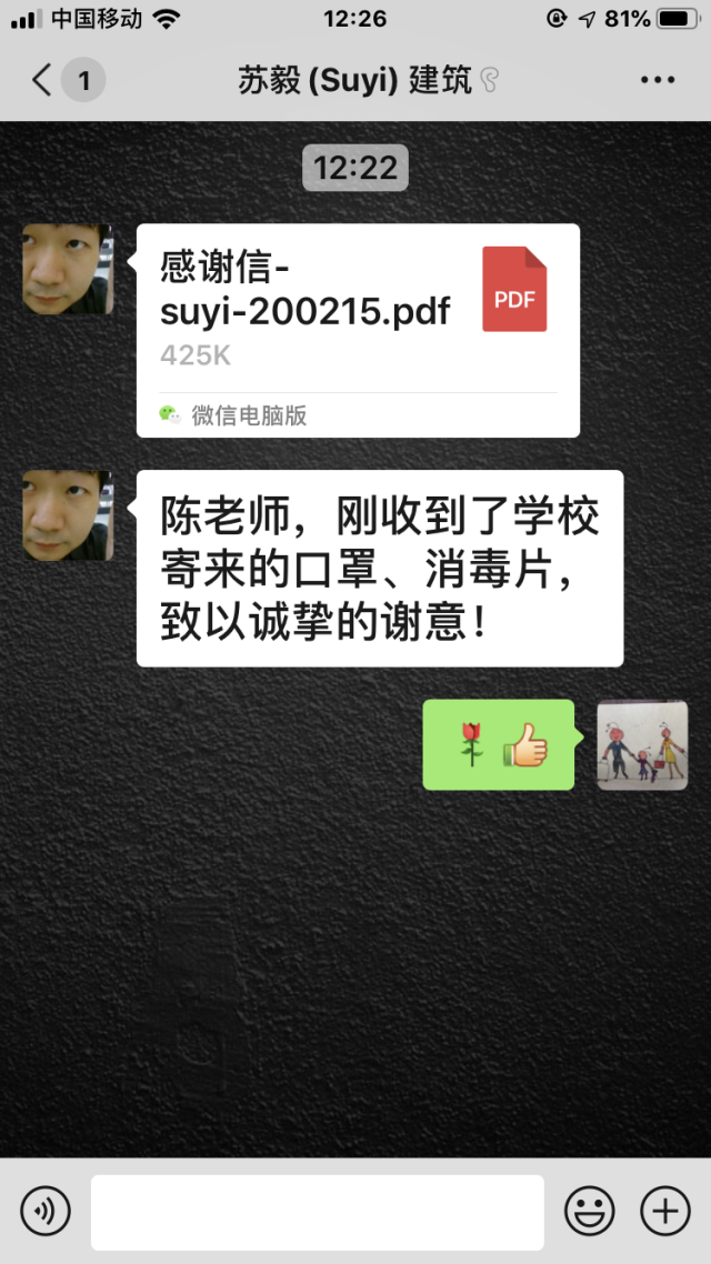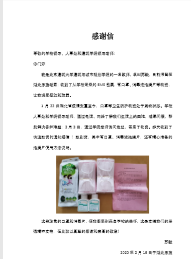 建筑学院对学院唯一在湖北地区的苏毅老师,从疫情开始,表达牵挂和关心。每天询问身体情况,党委书记何立新同志亲自联系爱心邮包,规划系系主任荣玥芳教授和规划系支部书记孙立教授代表系和支部表达了关心关爱。2月15日,建筑学院收到来自建筑学院滞留在湖北地区的苏毅老师的感谢信。在信中,苏老师表达了感谢学校和学院的关怀,给了他支撑的坚强精神支柱。