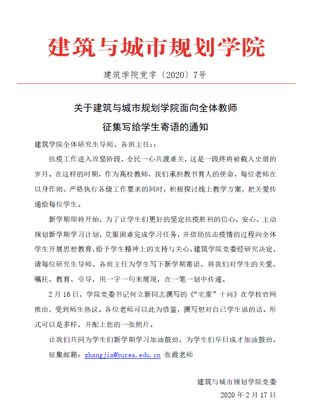 2月17日,建筑学院党委通过《关于斗地主游戏-单机斗地主下载 面向全体教师征集写给学生寄语的通知》的形式,希望每位研究生导师和班主任在抗疫时期,为学生写下新学期寄语,通过一字一句表达对学生的关爱、嘱托、教育、引导,为学生们新学期学习加油鼓劲,为学生们早日成才加油鼓劲。