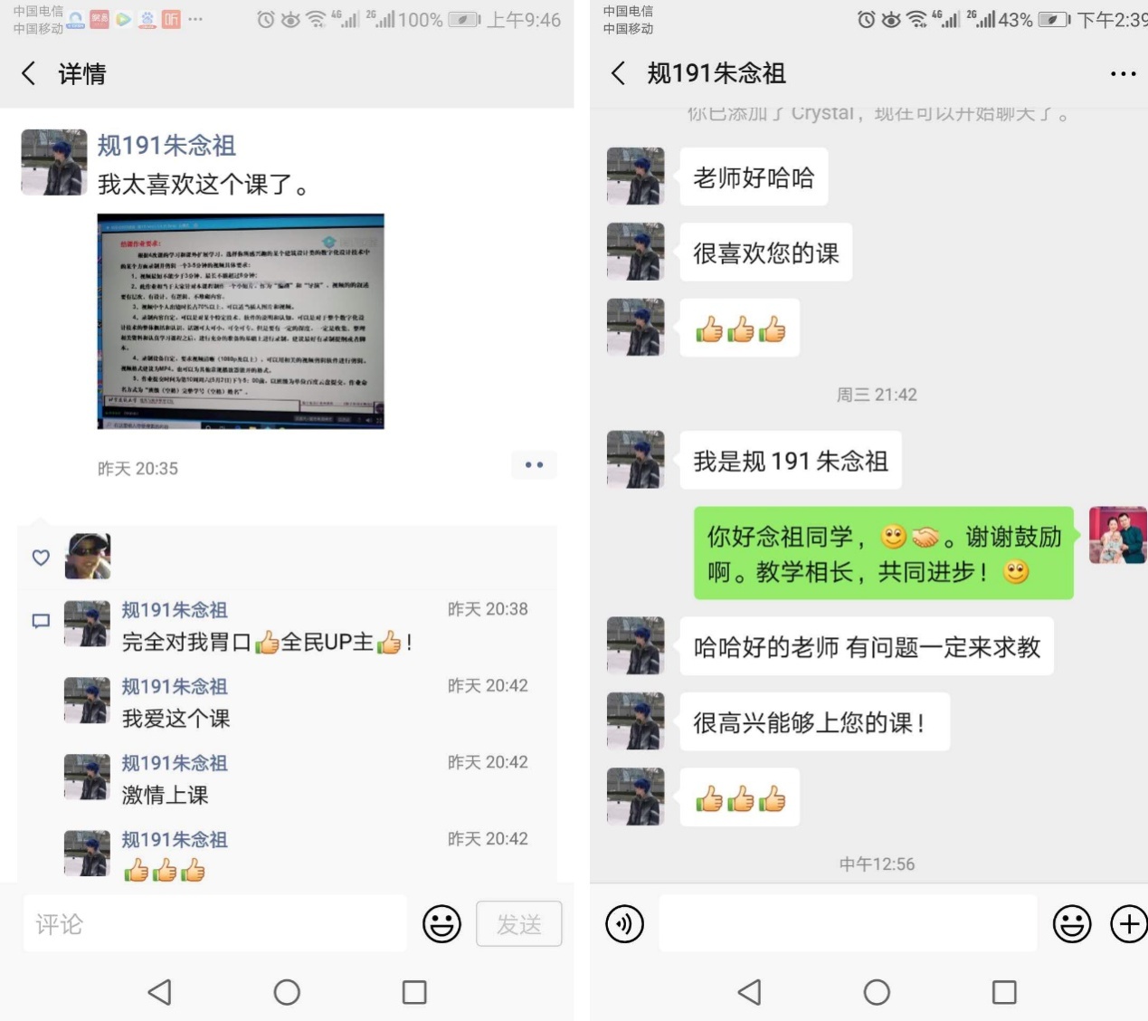 最后,杨老师表示,在这次全民抗“疫”的行动中,作为一个普通的党员教师,自己能做的就是打好在家中的教学战“疫”,把自己的每一堂课上好,能够上学生在自己讲授的课程中切实增长能力,学到知识,拓展视野,能够得到学生一句发自肺腑的“老师,我很喜欢您的课”的评价,就是对自己付出的最好的回馈。同时也在课程教学中不断听取学生的意见和建议,不断提高教学能力,改进教学方式,从自身多找原因,不因循守旧,不照本宣科,努力做到课堂氛围充实、生动,活跃,让自己的课堂内容不仅仅是知识的传授,更是思维的启迪、视野的扩展、方法的引导和经验的总结,在教学相长的氛围中不断进步,止于至善。