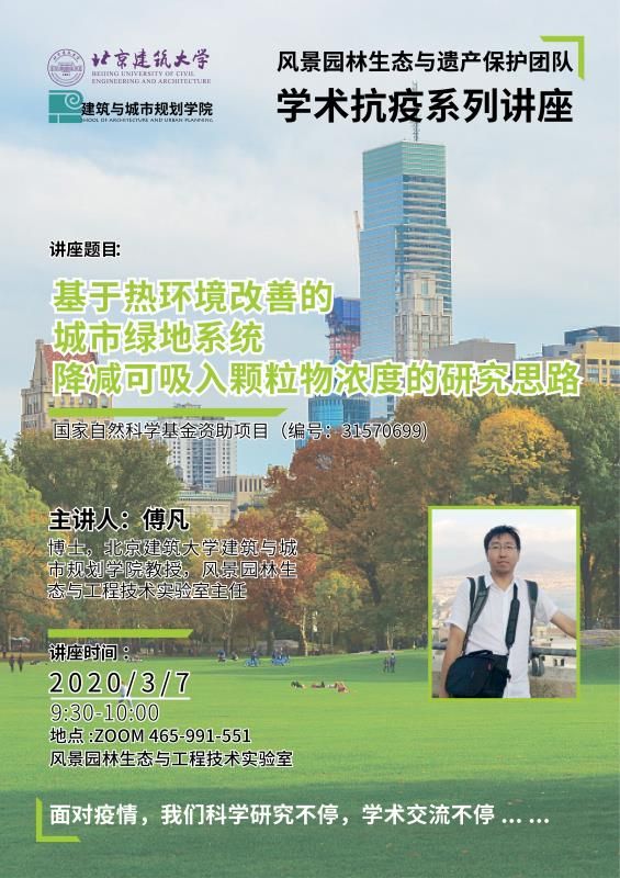 3月7日上午,建筑学院教授、风景园林生态与遗产保护团队负责人、风景园林生态与工程技术实验室主任傅凡老师通过Zoom平台开展网上“学术抗疫”系列讲座的第一讲。本次讲座以“基于热环境改善的城市绿地系统降解可吸入颗粒物浓度的研究思路”为主题,建筑学院师生、社会各界学者及公众等约五十余人积极参与本次讲座交流。