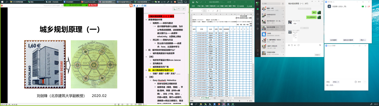 刘剑锋老师通过上述软硬件工具的结合,就可以有效组织各种课程。例如,他在讲授课中,在主显示器上用4/5的屏幕宽度播放ppt或视频,剩下1/5的宽度可以用于写板书,在副显示器上显示Zoom参会者、聊天栏、微信群、名单考勤表,以便随时关注和沟通信息。这当中还有一个小插曲,在《城乡规划原理(一)》的第一堂课时无法顺畅播放视频教学材料,视频时断时续,音频不仅断断续续而且刺耳,同学们纷纷提出反馈,刘老师在课前课后也做了各种试验,找不到更好的办法。第一次课师生都耐心坚持上完,课后刘老师赶紧上报教务申请调课,后经学院领导提议改到网络不那么堵的晚上再试一次,因此师生们商量又在周五晚10-11节(18:30-20:05)进行了一次试验,这次除少许视频卡顿外,整体比前次好很多。在这次试验中,又进一步测试发现,为了保障视频顺畅,需要在播视频时选择流畅度优先,这样会降低清晰度,因此当放ppt和写板书时需要再取消流畅度优先的选项,虽然来回切换比较麻烦,但经过试验这是能保障上课效果的最佳方式。