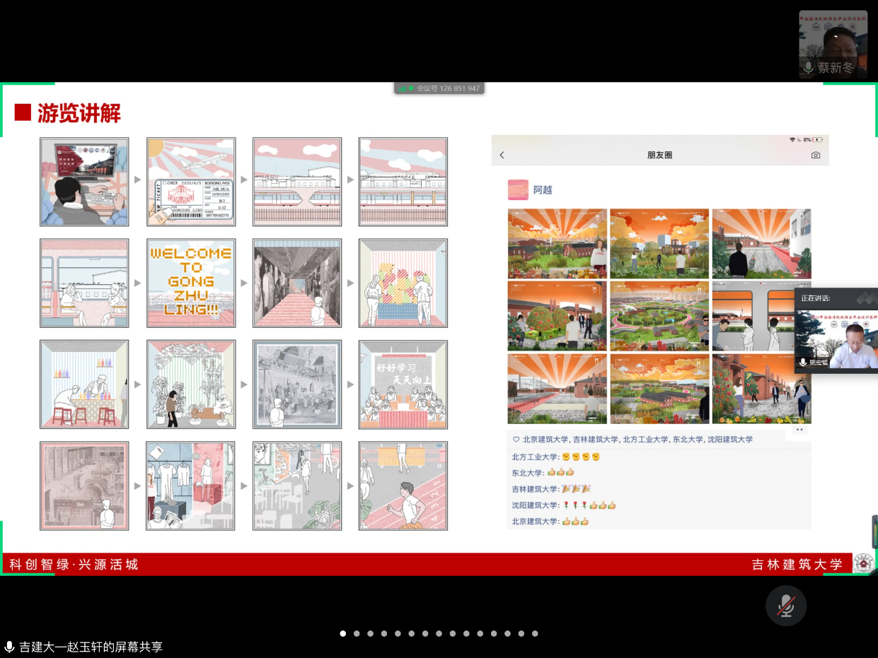 下午12:30起,终期汇报拉开序幕,首先介绍了来到此次会议的各位领导。之后以学校为单位,按照沈阳建筑大学3组,吉林建筑大学3组,北京建筑大学2组,东北大学2组的顺序先后汇报。每组汇报15分钟,教师点评与组别间交流10分钟。由于前一天每个小组的汇报录屏文件与演示文件都已上传,故当天每组仅用3分钟进行小组人员和小组方案成果的简单介绍,其余时间由老师及学生进行点评。每个小组的汇报都十分精彩,也各具特色。老师们和同学们在对各组成果表示认可的同时,也提出了针对性的改进意见。在3月11日的调研汇报和4月15日的中期汇报中,老师们分别提出了“聚焦地块,敞开心扉”和“突出特色,优化逻辑”下一阶段要求,同学们在终期汇报中也很好地完成了老师们的期待和要求。