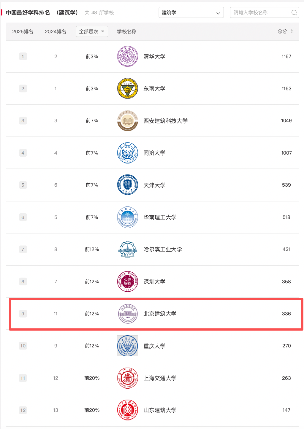 近日,高等教育专业评价机构软科正式发布“2025软科中国最好学科排名”,北京建筑大学建筑学学科位列全国第9名,排名层次进入全国前12%。