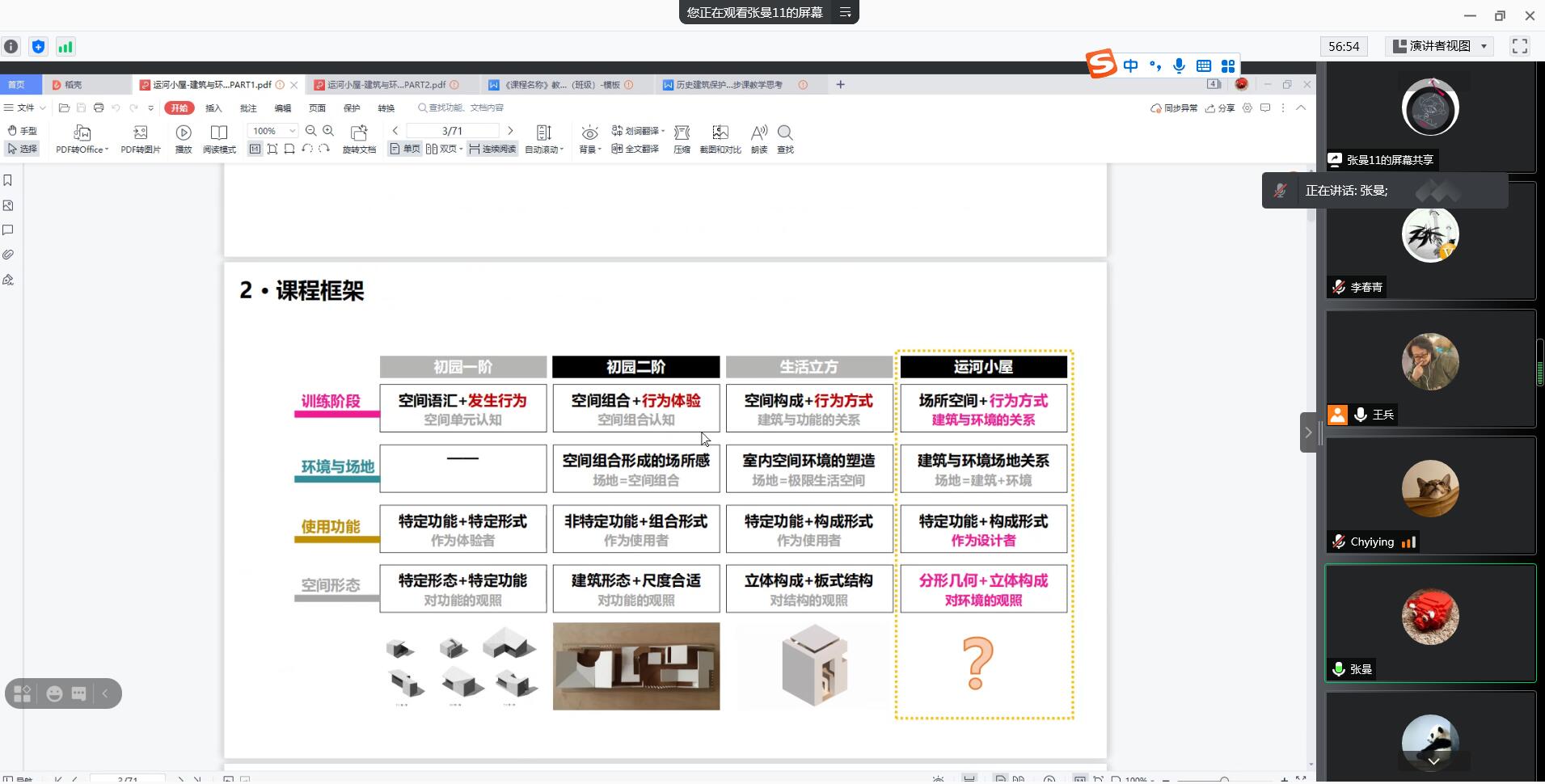 张曼老师介绍了一年级《设计初步》课程的题目设置内容,通过“运河小屋”等能够兼顾建筑遗产和建筑设计的题目,训练学生的对空间、场地的基本知识。杨一帆和马全宝老师介绍了二年级《建筑设计》课程,该课程题目通过不断的尝试与调正,逐渐固定了兼顾古建测绘、古建构造和建筑设计的四合院改造、文物建筑再利用等题目。齐莹老师介绍了三年级的设计课程,其中包括样式设计和历史街区改造与环境提升,从不同尺度、规模与社会人文环境培养学生的相关能力。