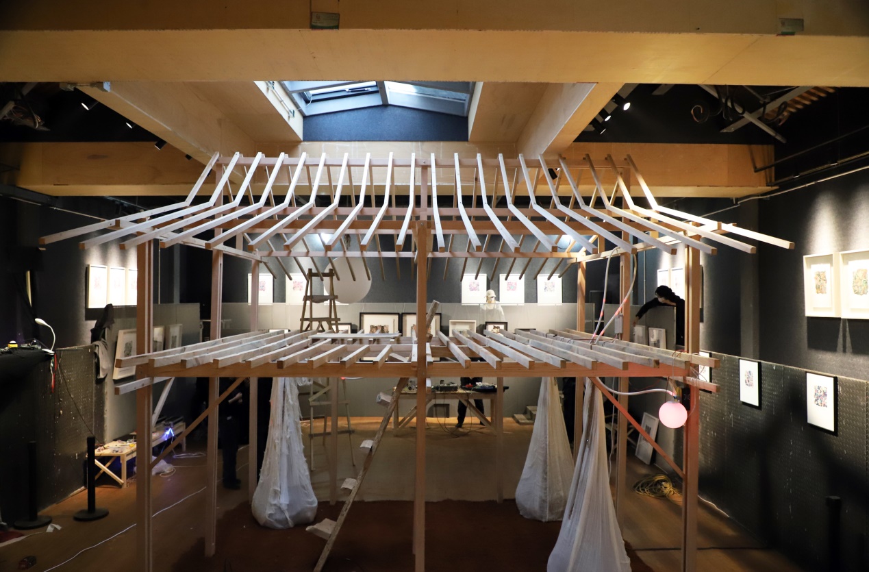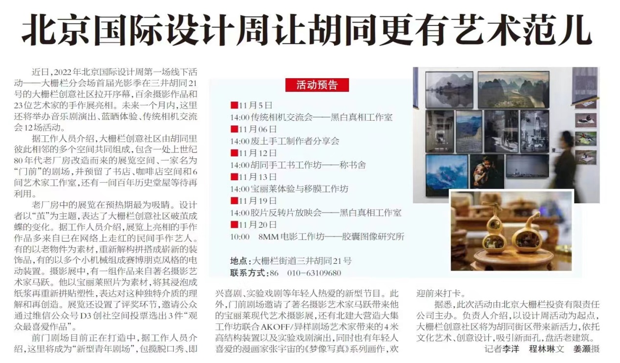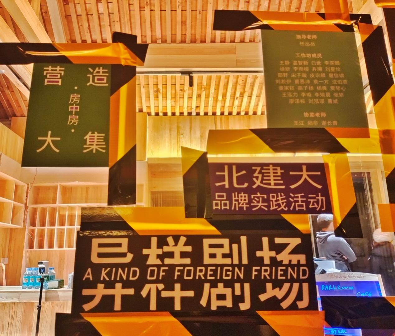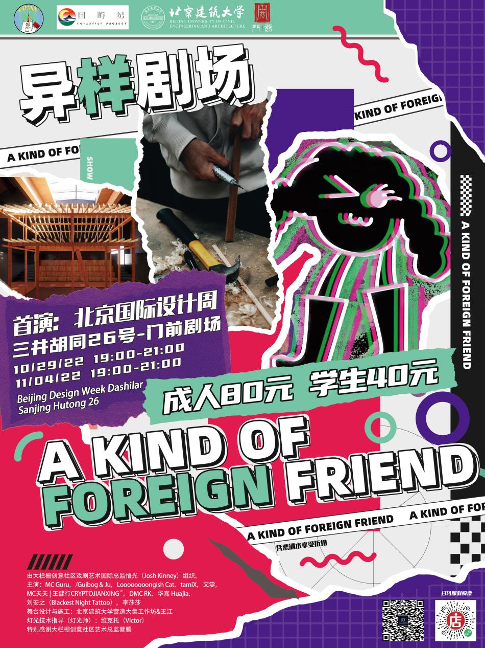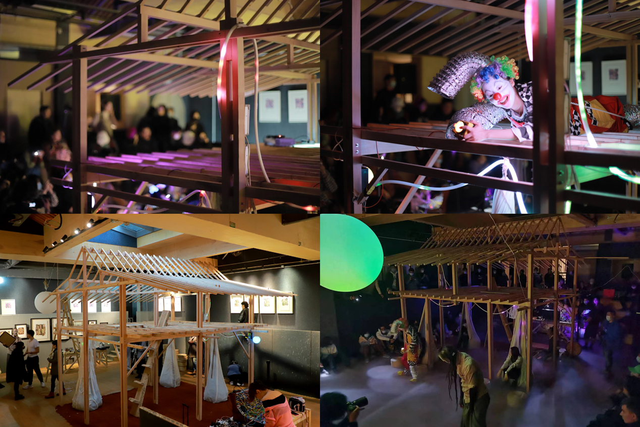 10月28日凌晨五点,天空还泛着星光,同学们就从学校出发,前往北京大栅栏三井胡同,开始准备一天的搭建工作。在非遗传承人木匠谢师傅的带领下,同学们以工作小组的形式,分工协作,最终顺利按时完成搭建工作。搭建完成后的次日,aKoff异样剧团的演出顺利举办。同学们与艺术家合作制作了海报和演出时的道具和家具,并在胡同内布置了视觉导览。演出当天效果出众,之后作为设计周的场馆装置,同学们搭建的成果又持续展览了三周。