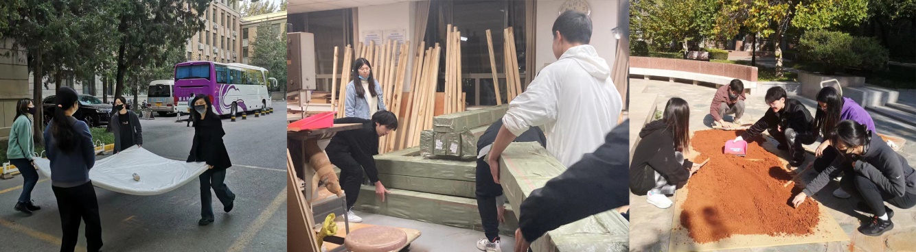 10月17日,招募志愿者通知发布,同学们报名、递交参与选拔的剧场设计图。随后,在推进方案的同时,对建造所需材料进行了估算,依据不同构件对受力要求的不同,选择购买不同种类的木材制作各类构件,并根据方案特色,选择了生土中心提供的红色散土作为地面敷设材料。之后,依照设计中所需要的构件种类和数量,对木料加工工作按部就班的进行推进。之后,依照设计中所需要的构件种类和数量,对木料加工工作按部就班的进行推进。
