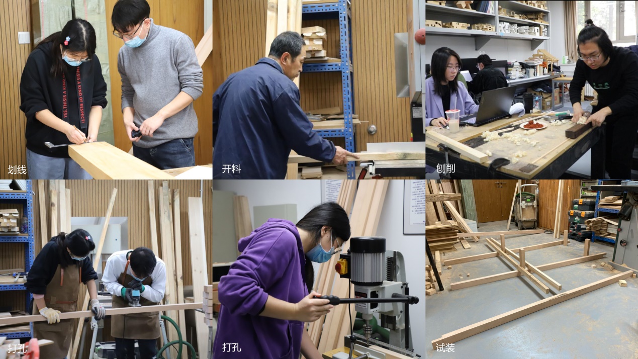 构件制作:(占比较大)(照片:划线、开料、割锯、刨削、打孔、试装)