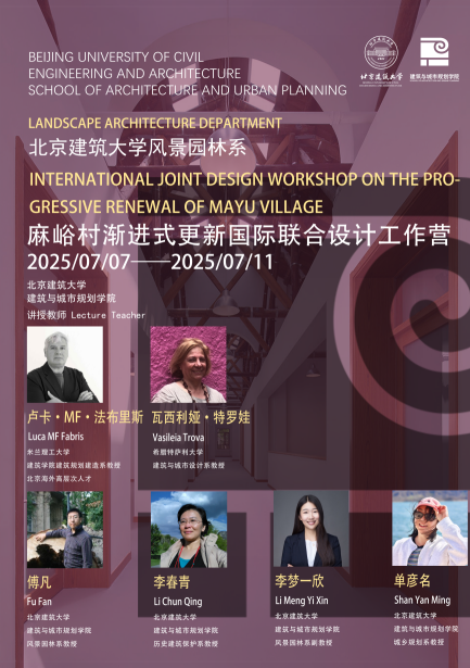 From July 7 to July 11, 2025, the “International Joint Design Workshop” was successfully held at the Xicheng Campus of Beijing University of Civil Engineering and Architecture (BUCEA). Jointly organized by the Department of Landscape Architecture and themed “Progressive Renewal of Mayu Village in Shijingshan District,” the workshop brought together three academic institutions: BUCEA, Politecnico di Milano (Italy), and the University of Thessaly (Greece). The workshop was guided by an esteemed team of instructors, including Professors Fu Fan, Li Chunqing, Shan Yannian, and Associate Professor Li Mengyixin from the School of Architecture and Urban Planning at BUCEA; Professor Luca MF Fabris from the School of Architecture at Politecnico di Milano; and Professor Vasileia Trova from the Department of Architecture and Urban Design at the University of Thessaly. Eleven graduate students from the 2024 and 2025 cohorts of BUCEA’s School of Architecture and Urban Planning participated in the program and successfully completed the workshop.