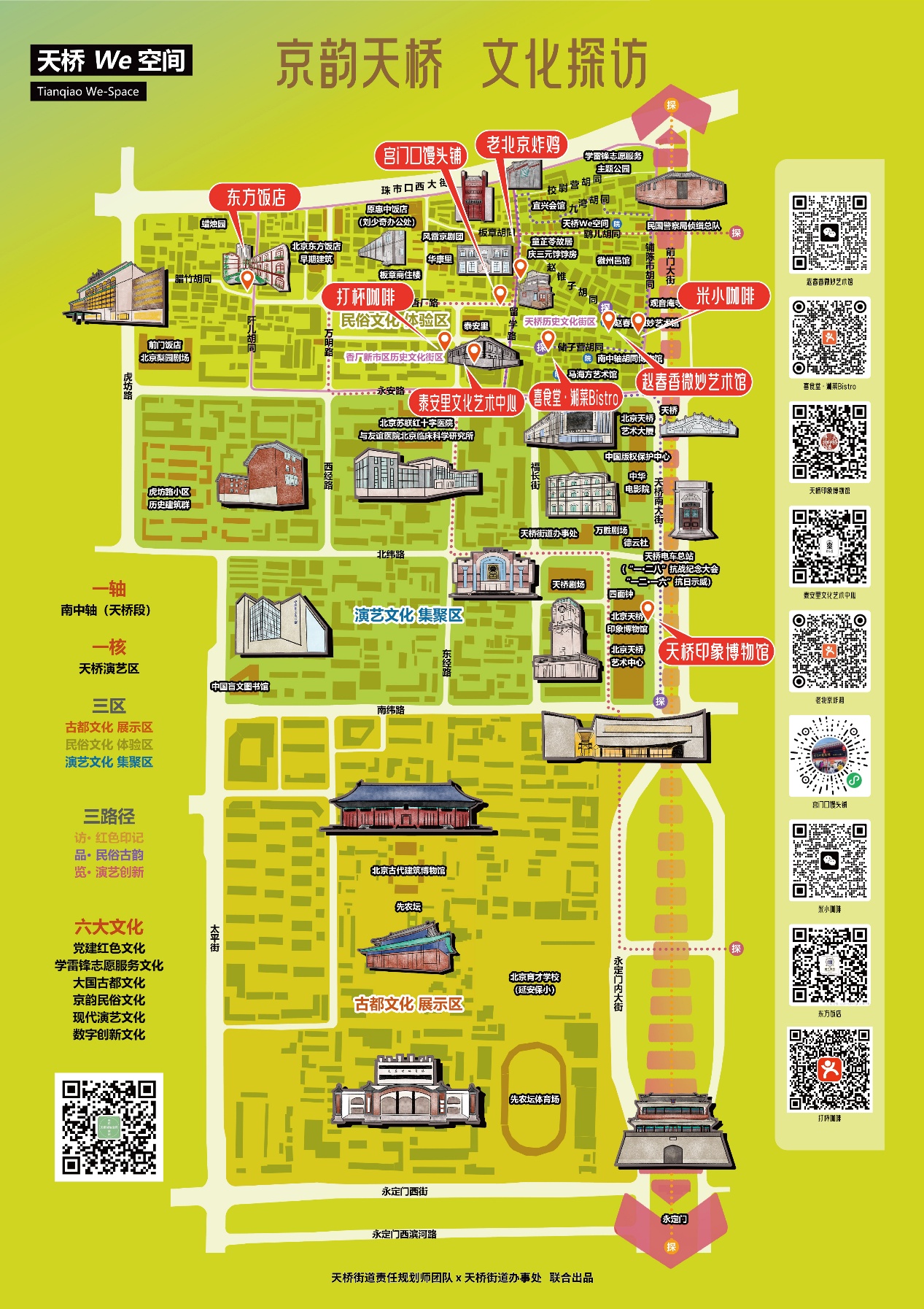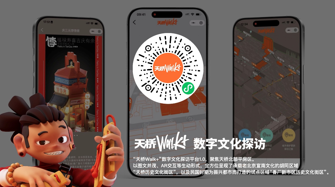 自2024年起,在斗地主游戏 责任规划师团队与街道办事处通力合作下,结合天桥北部平房区小微公共空间更新项目,同步布置了探访地图、方向指引、历史说明等形式多样的“京韵天桥·文化探访”导览设施100余处,市民和游客可通过扫码进入数字平台,实现“线上线下融合”的文化探访新模式。