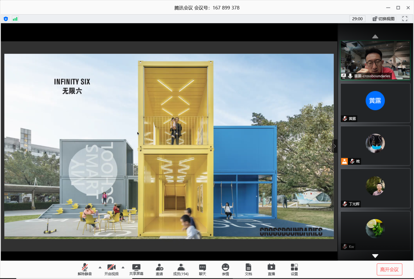 董灏回顾了其多个阶段的实践作品,从理念思考、方案生成、材料构造等方面,向线上听众阐述他对“建筑与城市”“客户与社区”的理解,同时对学生听众提出“搭建从学习到实践、从社会需求到人际交往间的桥梁,从而让设计更好的服务使用者”等期望。在自由提问阶段,同学们踊跃发言,提出关于幼儿园设计特点、建筑的形式选择、建筑评价等问题,董老师逐一详细解答。