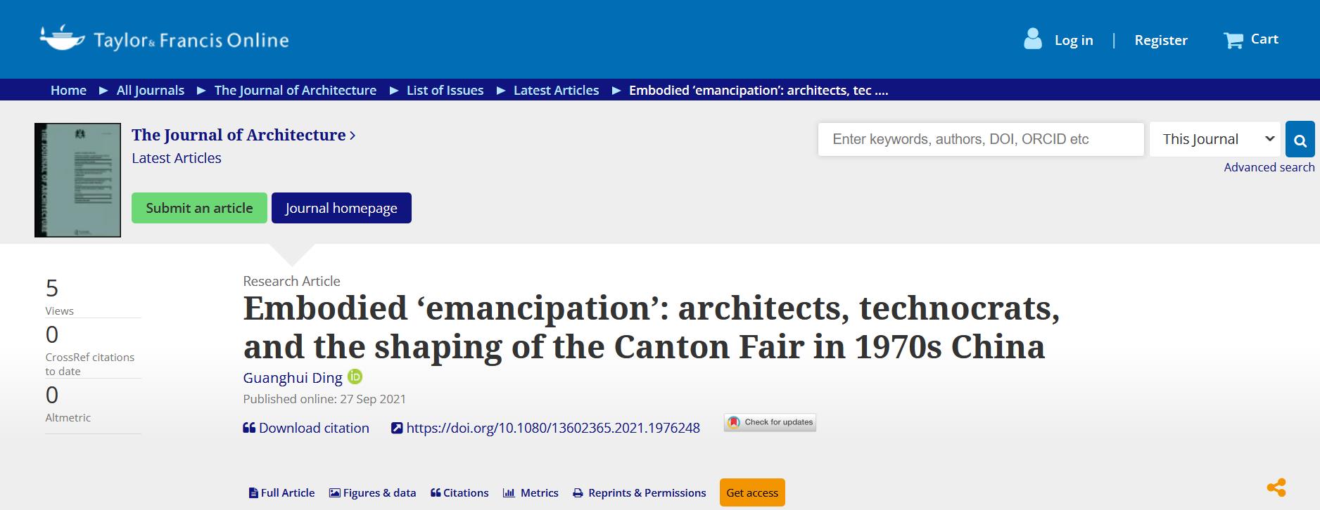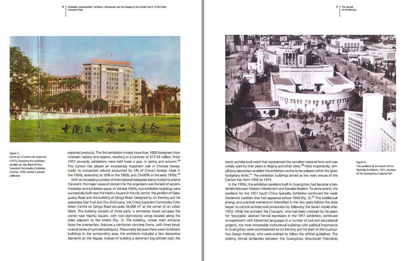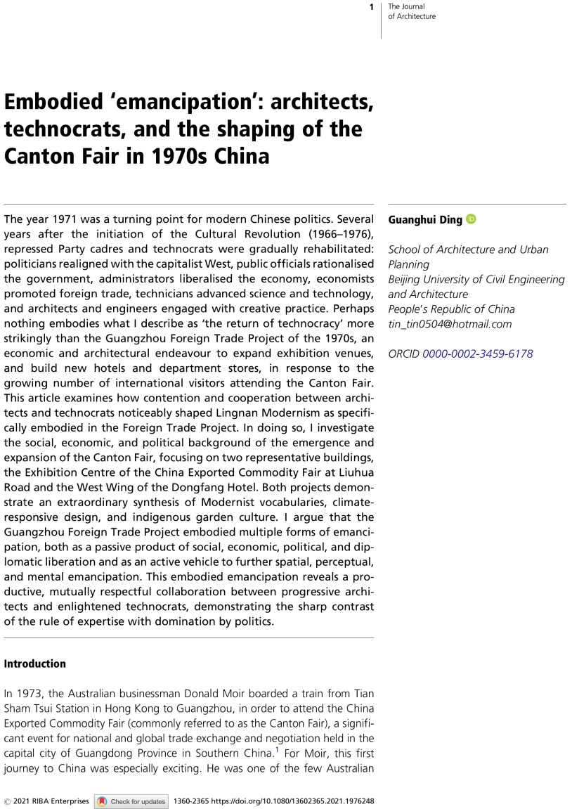 第一篇论文Embodied ‘emancipation’: architects, technocrats, and the shaping of the Canton Fair in 1970s China (再现“解放”:建筑师、专业干部和1970年代中国的广交会建筑),研究了在20世纪70年代,岭南建筑师与技术官员之间的竞争与合作,塑造了当时中国重大建筑基础设施建设的典范——广州广交会展览馆和系列酒店建筑。论文指出,广州外贸工程项目体现了多种形式的解放——它既是社会、经济、政治和国际关系变化的被动产物,又是进一步促进物质空间、个人感知和思想解放的积极工具。这种解放揭示了进步建筑师和开明技术官员之间富有成效的、相互尊重的合作,展现了尊重建筑学专业知识的重要性。