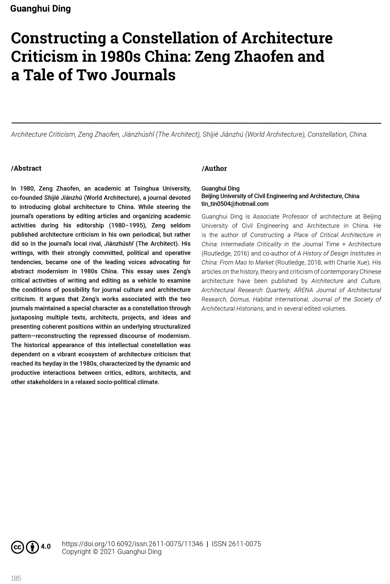 第二篇论文Constructing a Constellation of Architecture Criticism in 1980s China: Zeng Zhaofen and a Tale of Two Journals (构建中国建筑批评的“星丛”:曾昭奋、《建筑师》和《世界建筑》的双刊记),探讨了清华大学建筑评论家曾昭奋先生(1938-2020)与建筑期刊《建筑师》和《世界建筑》的互动,以及这种学术互动带给中国建筑界的关键影响。曾昭奋的评论通过并列多个文本、不同建筑师的作品和思想,并呈现出连贯性立场——他和上述专业期刊试图重建被压抑的现代主义话语。