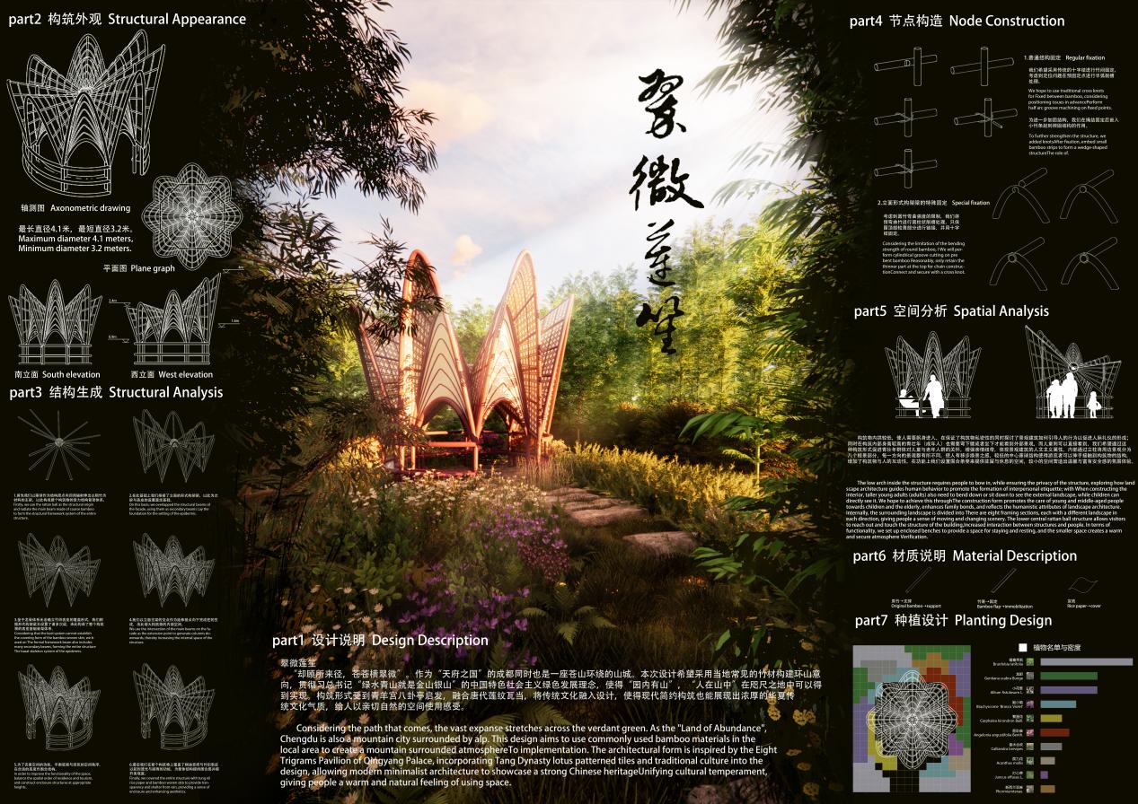 设计说明:翠微莲生在远离叠嶂的城市公园中让人感受望山雅致与游山趣味。通过拱的高度设计来促进青年与老人儿童的关系。通过宣纸的使用对光进行柔化处理,为人们构建如在山中坐的温馨和静谧的空间体验。“不识庐山真面目,只缘身在此山中”,通过八面框景不同风格的植物配置使人有移步换景的丰富观游体验。“绿水青山就是金山银山”,贯彻中国特色社会主义绿色发展理念"。使得“园内有山”,“人在山中”的愿景在咫尺之地中可以得到实现。