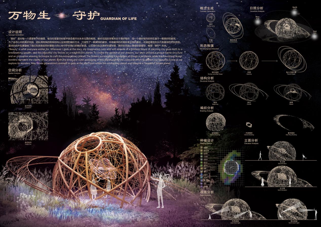 设计说明:"美好"是对每一个愿望的憧憬,每当我们仰望星空时都会不禁展开对未来无限的畅想。美好花园的孕育源自星球中的美好城市,以此为概念原型,环绕星球的花草象征着自然万物,蓬勃的花境寓意着勃勃生机,而星球内外包裹着我们同心守护的“家园”愿景。未来,人们可以在花园中继续仰望星空,畅想美好的未来。