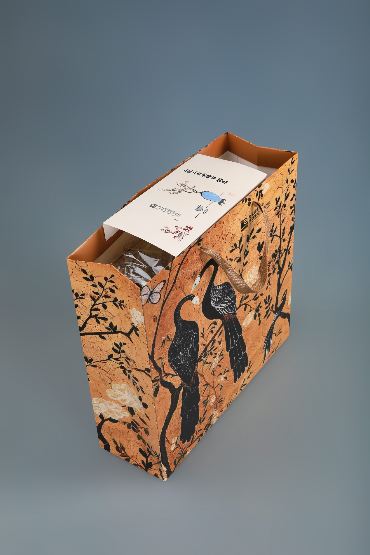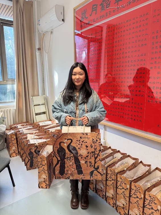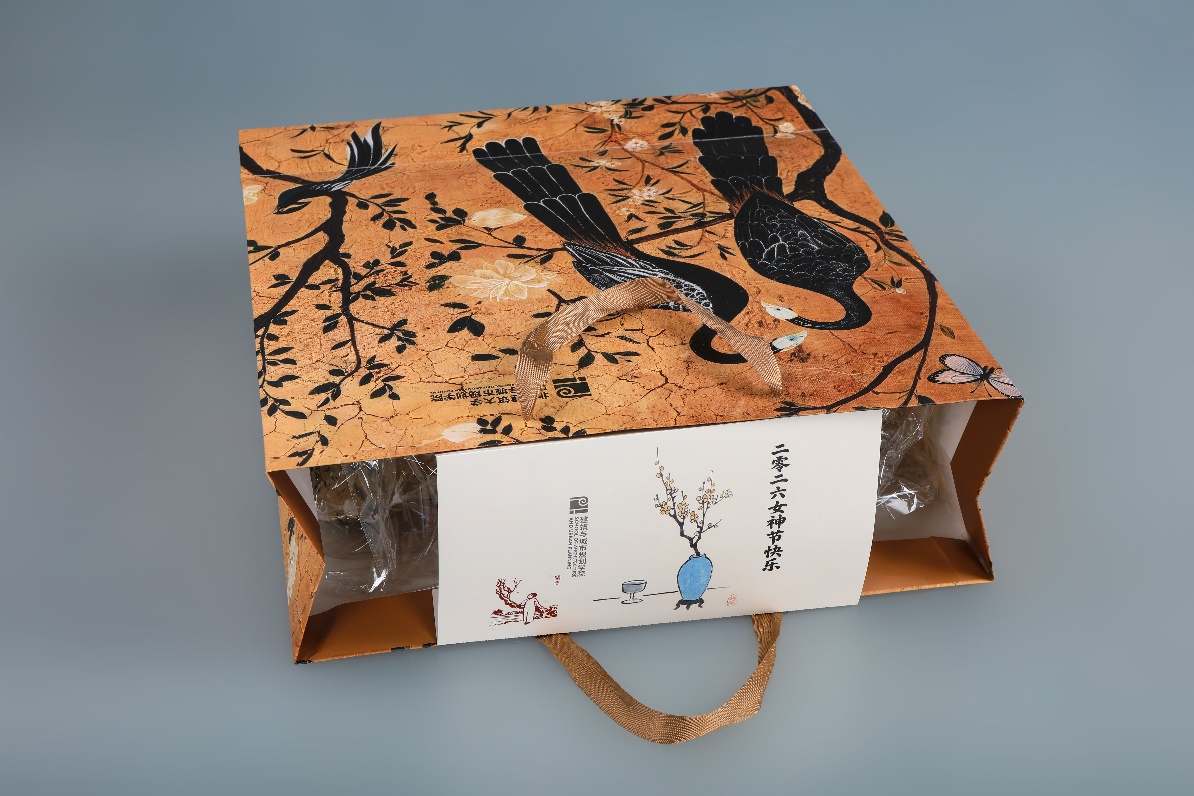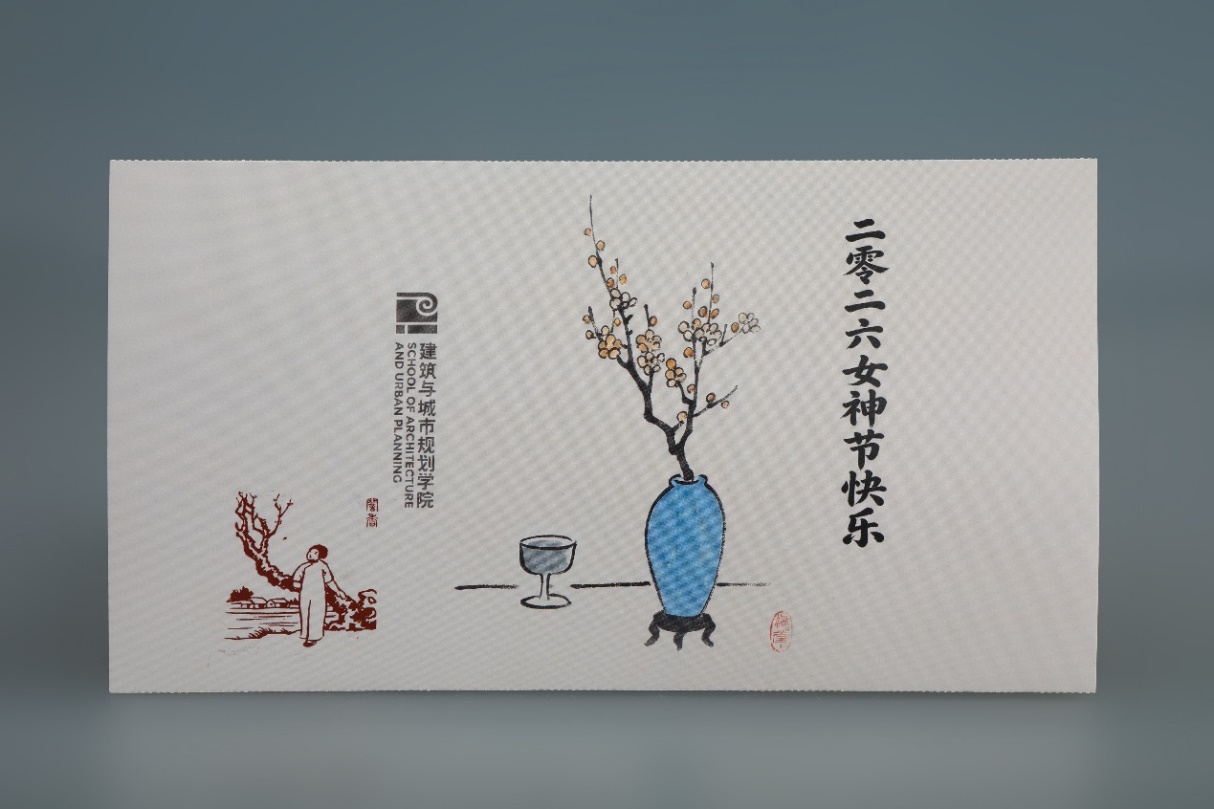 礼物的包装袋图案采用与坐垫、靠腰相同的花鸟纹设计。包装袋封口卡片由学院涂先明老师设计,卡片设计采用了丰子恺的作品作为主要的图形元素。丰子恺是画家、文学家、美术和音乐教育家,他始终关注人性的本真和生活的意趣,作品整体画面简洁,画风朴实,在其传统写意的水墨作品中以书入画,以诗入画,充满着诗意的表达。封口卡片设计中左侧所选的古诗新画作品,远处是乡村、田野,近处是一株梅树,前边站着一位温婉的知识女性,整体透着从容之美;右侧所选的瓶梅与杯酒,则透着一份温柔与诗意。左侧“古诗新画”作品图像辅以小篆字体的“暗香”,由学院杨振老师进行篆刻印章制作。包装封口采用蚂蚁线制作,老师们领取礼物后可以轻松撕下封口卡片留念或作为书签使用。礼物得到了女教师们的喜爱,大家感受到来自学院的一份关怀和温暖。