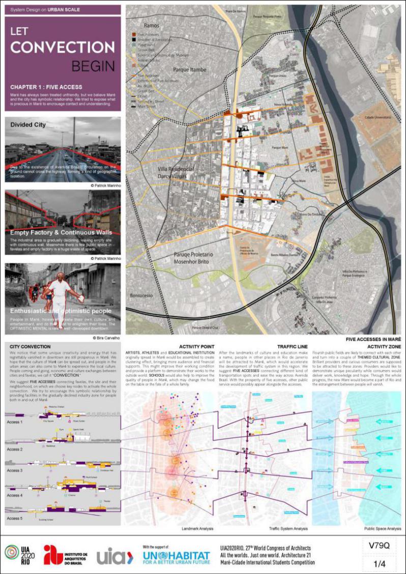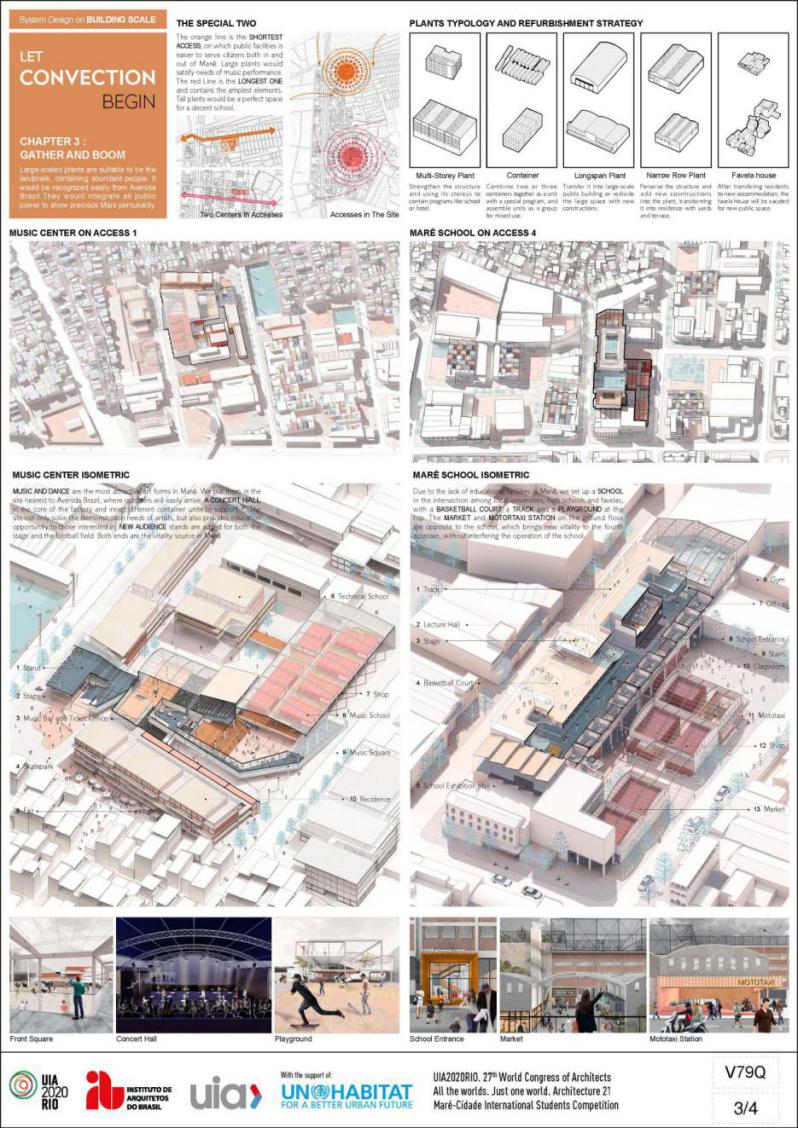 获奖作品选择地块位于巴西里约热内卢的马里——一个正在逐渐衰落的工业区。在这里,已经消失于市中心的具独特创造力和活力的活动,例如街头桑巴舞、实验性说唱音乐和民间比赛仍然繁荣。设计者意图邀请人们体验并传播马里的文化,并以此激发、促进城市繁荣地区和贫民窟间的经济和文化交流,并将其形容为“对流”。在城市尺度上,设计者抓取五条轴线连接贫民窟、设计基地及其周边地区,并在轴线中选择部分关键节点,将工厂改造成文化和教育地标,以激活贯穿城市空间的“对流”。在区域和建筑尺度上,设计者将建筑分为三大类,提出不同的策略,以在教育、交通、公共空间和住房方面提高马里的公共环境和建筑空间质量。