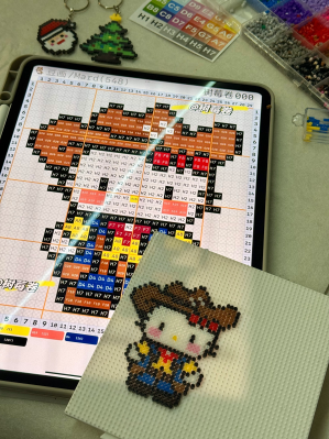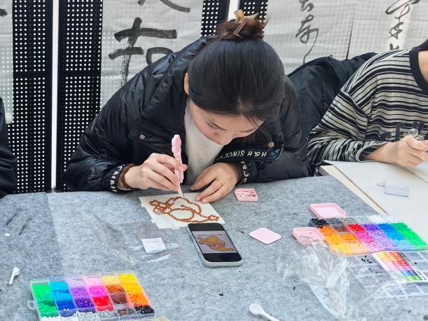 拼豆创意活动现场,大家围坐桌前,用小巧的镊子精心拾取五彩豆粒,在方格板上悉心拼缀。先在拼板上勾勒出基础轮廓,再将豆粒依照不同色块区域被分门别类放置,操作时,同学们需保持手腕稳定,将直径仅数毫米的柱状拼豆精准嵌入板面。当最后一颗拼豆归位,整幅作品被覆上专用烫片,经过恒温熨烫后,不起眼的塑料豆,经过巧妙构思与耐心摆放,逐渐化为萌趣的卡通形象、精致的几何图案,甚至是微缩的建筑轮廓。