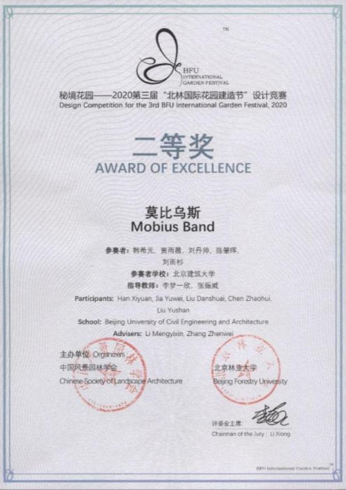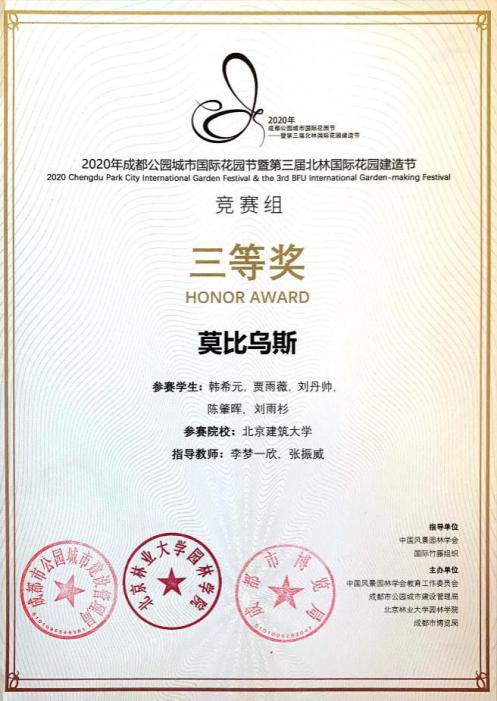 建筑学院由张振威老师和李梦一欣老师指导风景园林2017级本科生刘丹帅、刘雨杉、韩希元、陈肇晖、贾雨薇组成的队伍经过层层筛选分别斩获了2020第三届“北林国际花园建造节”设计竞赛二等奖和 “2020年成都公园城市国际花园节暨第三届北林国际花园建造节”竞赛组三等奖。