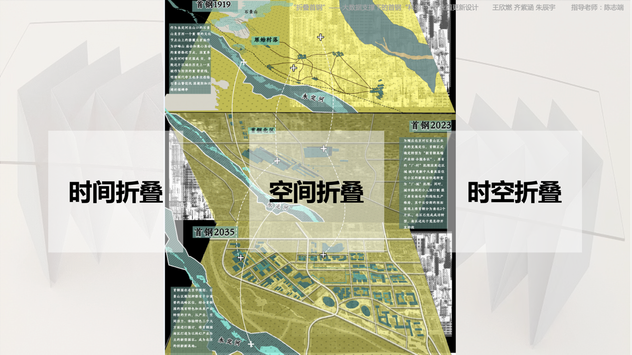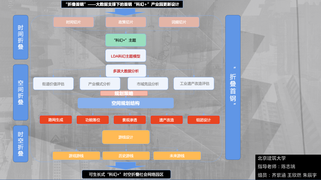 首钢组团队以“折叠首钢”为主题,团队以时空折叠为设计主线,将不同时间阶段的首钢通过虚拟技术叠加再现,形成首钢园区的特色形象展示方式,通过引入科幻+的多种新型业态助力首钢园区进一步转型发展。小组创新性的使用了大数据分析及AI引擎进行前期的数据调查与模拟验证,使方案具有更强的说服性,在汇报的众多团队中脱颖而出。