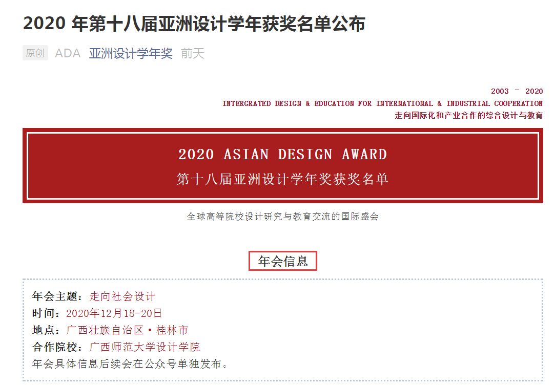 11月初,建筑学院师生在“2020 年第十八届亚洲设计学年奖”评选中获得“一金、一银、二铜、二优秀、一优秀组织、一优秀指导”共八项奖项。亚洲设计学年奖(2003年-2020年)致力于打造亚洲国家和地区高校间更大范围、更大规模、更深入交流、更具影响力的专业权威性设计交流盛会。从2003年至今,经过17年的积累,在建筑、景观、室内、展示、光环境、城市设计的框架和基础上,将国际、国内的设计界、设计高校、协会组织等充分对接,成为推进学术界与产业界交流和发展的平台。