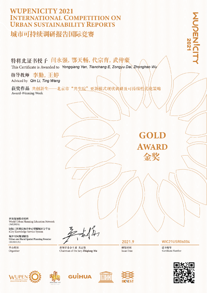 9月21日,由世界规划教育组织联合国教科文组织iCity网站联合举办的“2021WUPENiCity城市设计学生作业国际竞赛与城市可持续调研报告国际竞赛”金奖正式发布!斗地主游戏-单机斗地主下载 城乡规划系参赛队伍闫永强、鄂天畅、代宗育、武仲豪同学提交的调研报告“共创新生——北京市共生院更新模式现状调研及可持续性优化策略”(指导老师:李勤,王婷)荣获调研报告类金奖。