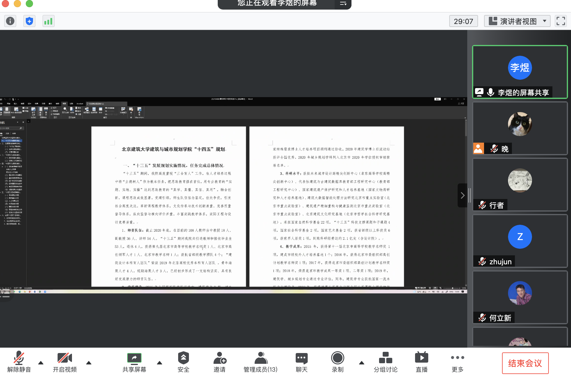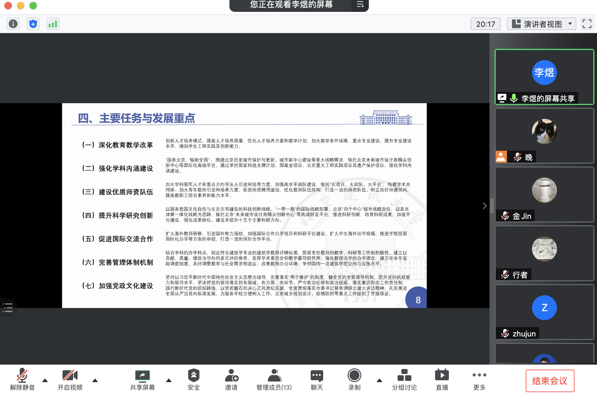 院长张杰提出,学院十四五规划已形成较为完善的整体框架,下一阶段需继续与学校十四五规划报告进行仔细对标,分解任务,梳理完善报告内容。党委书记何立新针对教学环境改善、教学与科研能力提升、学生思想政治教育、青年教师培养、结合专业与师生特点的党建美育品牌、交叉学科突破、学科专业建设与改革等内容提出意见建议,与会教师针对报告内容展开充分讨论。