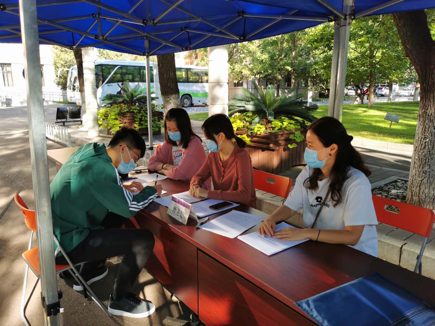 9月18日上午8:30,一个阳光灿烂的日子,北建大建筑学院迎来了2020级风景园林专业8名双培新生。风景园林系双培计划负责人张振威,学院教务办公室刘志刚、学院学工办公室吴昕泽、孙萌3位老师以及学校教务处老师在西城校区教1楼前给新生办理入学手续。